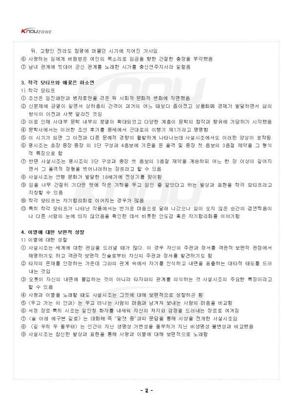 1. ªÀº À̺°, ±ä ±×¸®¿ò 1) ªÀº À̺°, ±ä ±×¸®¿òÀÇ Ç¥Çö ¨ç Áß±¹ ³²Á¶ ½Ã´ëÀÇ ¹®ÀÎ °¾öÀº¡´º°ºÎ¡µ¸¦ Áö¾î ¡°´µ ¶ó¼ ÇѼø°£ À̺°ÀÇ Àå¸éÀ» ±×·Á ±æ°í ±ä À̺°ÀÇ Á¤À» ½á³¾ ¼ö ÀÖÀ¸¸®¿À¡±¶ó°í À¼¾úÀ½ ¨è À̺°ÀÇ ¼ø°£Àº ±×´ÙÁö ±æÁö ¾ÊÁö¸¸, ±×·Î ÀÎÇÑ ½½ÇÄÀº ¿À·¡µµ·Ï Áö¼ÓÇÑ´Ù´Â ¶æÀ¸·Î ÇØ¼®µÊ ¨é ÀÌ °ßÇØ¿¡ µû¸£¸é À̺° ³ë·¡ÀÇ ¹¦¹Ì´Â ÇѼø°£ À̺°ÀÇ Àå¸éÀ» ±×¸²À¸·Î½á °ñ¼ö¿¡ »ç¹«ÃÄ Áö¿öÁöÁö ¾Ê´Â¡¤ ±¦ÂúÀº µíÇÏ´Ù°¡µµ ¹®µæ ¾ö½ÀÇÏ´Â ½½ÇÄÀ» ½á³»´Â µ¥¿¡ ÀÖÀ½ ¨ê °¾öÀÇ¡´º°ºÎ¡µ´Â °í·Á¿Í Á¶¼±ÀÇ ¹®Àε鿡°Ô ÀûÁö ¾ÊÀº ¿µÇâÀ» ¹ÌÃÆÀ½ ¨ë Á¤Áö»óÀÇ¡´¼ÛÀΡµÀº ¡°º½ Ç®Àº Ǫ¸£¸£°í º½ ¹°°áµµ ÀÏ··À̴µ¥ ³²Æ÷¿¡¼ ÀÓ º¸³»´Ï ±× ¾ÆÇ ¸¶À½ ¾îÂîÇұ¶ó´Â¡´º°ºÎ¡µÀÇ Ç¥ÇöÀ» ºô·Á ¾´ ÇѽÃÀÓ ¨ì °¾öÀÇ¡´º°ºÎ¡µ´Â °í·Á¿Í Á¶¼±ÀÇ ¹®Àε鿡°Ô ÀûÁö ¾ÊÀº ¿µÇâÀ» ¹ÌÃÆÀ½ ¨í ¸ÅâÀº Àü¶óµµ ºÎ¾ÈÀÇ ±â»ýÀÌ¸ç ½º½º·Î È£¸¦ ¸ÅâÀ̶ó ÇÑ °ÍÀ¸·Î ¾Ë·ÁÁ® ÀÖÀ½ ¨î <ÕÙü£éë ÈʻѸ± Á¦¡µ ½ÃÁ¶´Â ²Éºñ°¡ Èð»Ñ¸®´ø º½³¯ Çì¾îÁø ÀÓ¿¡ ´ëÇÑ ±×¸®¿òÀ» ³ë·¡ÇÔ 2. °£Àý°ú ±â´Ù¸²°ú Áö±ØÇÑ Á¤¼º 1) ±â³à½ÃÁ¶ ¨ç ȲÁøÀÌ´Â Á¶¼± Àü±âÀÇ ±â»ýÀÌÀÚ ½ÃÀÎÀÓ ¨è ±èõÅÃÀº¡¸±Ô¼ö»ïÀΡ¹À̶ó´Â Ç׸ñÀ» ¸¸µé¾î ³õ°í ȲÁøÀÌ¿Í ¼Ò¹éÁÖ¡¤¸ÅÈ ¼¼ ±â»ýÀÇ ½ÃÁ¶¸¦ ¼Ò°³ÇßÀ½ ¨é ±â»ýÀ» ½ÃÁ¶ÀÇ ÁÖ¿ä ÀÛ°¡ÃþÀ̶ó ÀÎÁ¤ÇÑ °ÍÀÓ ¨ê ȲÁøÀÌ´Â µ¿Áþ´Þ ±â³ª±ä ¹ã¡¤°´°üÀûÀ¸·Îµµ ±æÁö¸¸ ÀÓ°ú ÇÔ²²ÇÏÁö ¸øÇÏ¿© ´õ ±æ°Ô ´À²¸Áö´Â ¹ãÀÇ Ç㸮¸¦ º£¾î ³»¾î º½³¯ ÀÌºÒ ¾Æ·¡ °ö°Ô Á¢¾î µÎ¾ú´Ù°¡ »ç¶ûÇÏ´Â ÀÓÀÌ ¿À½Å ³¯ ¹ã¡¤ ¹«Ã´À̳ª ª°Ô ´À²¸Áú ¼ö¹Û¿¡ ¾ø´Â ¹ã¿¡ ±ÁÀ̱ÁÀÌ ÆîÃÄ ³¿À¸·Î½á ±ä±ä¹ã ÀÓ°ú ÇÔ²² »ç¶ûÀ» ¼Ó»èÀÌ°í ½ÍÀº ¸¶À½À» Ç¥ÃâÇßÀ½ ¨ë È«¶ûÀº ¼±Á¶ ¶§ ÇÔ°æµµ È«¿ø¿¡¼ Ȱµ¿ÇÑ ±â»ýÀÌ¸ç »ï´ç½ÃÀÎ °íÁ× ÃÖ°æÃ¢°ú Àο¬À» ¸ÎÀº °ÍÀ¸·Î ¾Ë·ÁÁ® ÀÖÀ½ ¨ì <¹¤¹öµé °¥È÷ °Í°Å¡µµµ ÀÌ·¯ÇÑ ¸Æ¶ô ¾È¿¡¼ Àü½ÂµÇ¾ú´Âµ¥, ½ÃÀû ÈÀÚÀÇ ºÐ½Å°ú °°Àº ¹¤¹öµéÀ» ÀÓ¿¡°Ô º¸³»¸é¼ ÀÓÀÌ ±×°ÍÀ» º¸°í Àڱ⸦ »ý°¢ÇØ Áֱ⸦ ¹Ù¶ó´Â ½ÉÁ¤À» ³ë·¡ÇßÀ½ ¨í ¸ÅâÀ̳ª ȲÁøÀÌ, È«¶û µîÀÇ ±â»ýÀº õÀÎÀ̸鼵µ »ç´ëºÎ¸¦ »ó´ëÇØ¾ß Çß´ø Ư¼ö ½ÅºÐÀ¸·Î¡¤ ÀÏÁ¤ÇÑ ¼Ò¾çÀ» °®Ãß¾î Çѽø¦ Áþ±âµµ ÇÏ°í ½ÃÁ¶¸¦ âÀÛ¡¤ÇâÀ¯Çϱ⵵ ÇßÀ½ ¨î À̵éÀÌ ³²±ä ½ÃÁ¶¸¦ ±â³à½ÃÁ¶¶ó ÁöĪÇϴµ¥¡¤»ç´ëºÎ°¡ ½ÃÁ¶ÀÇ Ã¢ÀÛ°ú ÇâÀ¯¸¦ ÁÖµµÇÏ´ø ½Ã´ë¿¡ ±â³à½ÃÁ¶´Â ÁÖ·Î ¾ÖÁ¤À» ´Ù·ëÀ¸·Î½á ½ÃÁ¶ÀÇ ³»¿ë°ú Ç¥ÇöÀ» È®ÀåÇß´Ù°í Æò°¡ÇÒ ¼ö ÀÖÀ½ 2) Ãæ½Å¿¬ÁÖÁö»ç ¨ç ¼Û° Á¤Ã¶Àº °¡»ç¸¦ Àß Áö¾î¡´°üµ¿º°°î¡µ¡¤¡´»ç¹ÌÀΰ,¡´¼Ó¹ÌÀΰ¡¤¡´¼º»êº°°î¡µÀ» ³²°åÀ½ ¨è ÀÌ·Î ÀÎÇØ ½ÃÁ¶¿¡ ´ÉÇß´ø °í»ê À±¼±µµ¿Í ¦ÇÏ¿© ¡®°í»êÀÇ ½ÃÁ¶¡¤¼Û°ÀÇ °¡»ç¡¯¶ó´Â ¸»ÀÌ ³ª¿À±âµµ ÇßÀ½ ¨é Á¤Ã¶Àº ¿©µç¼¼ ¼öÀÇ ½ÃÁ¶¸¦ ³²±ä ´ÙÀÛ ÀÛ°¡À̱⵵ ÇÔ ¨ê <³» ³´ »ê±é °Ý»ï¡µ¿¡¼´Â »ý°ßÀ¸·Î ¸¸µç Àû»ïÀ» »¡°í ´Ù½Ã ¹ß¾Æ¼ µÇ³ª µÈ ºµ¿¡ ¸»¸° ´ÙÀ½¡¤´Ù¸®°í ¶Ç ´Ù¸®´Â ÈÀÚÀÇ ÇàÀ§¸¦ Á¦½ÃÇÏ¿© ÀÓÀ» ÇâÇÑ ÀÚ½ÅÀÇ »ç¶û°ú Á¤¼ºÀ» ³ë·¡Çϰí ÀÖÀ½ ¨ë¡´»ç¹ÌÀΰÀº Á¤Ã¶ÀÌ ¿À½Ê ¼¼°¡ µÇ´ø 1585³â£¨¼±Á¶18£©µ¿Àΰú ¼ÀÎ »çÀÌÀÇ ´çÀïÀ¸·Î °üÁ÷¿¡¼ ¹°·¯³ µÚ, °íÇâÀÎ Àü¶óµµ âÆò¿¡ ¸Ó¹°´ø ½Ã±â¿¡ Áö¾îÁø °¡»çÀÓ ¨ì »ç¶ûÇÏ´Â ÀÓ¿¡°Ô ¹ö¸²¹ÞÀº ¿©ÀÎÀÇ ¸ñ¼Ò¸®·Î ÀÓ±ÝÀ» ÇâÇÑ °£ÀýÇÑ ÃæÁ¤À» ºÎ°¢ÇßÀ½ ¨í ³²³à °ü°è¿¡ ºø´ë¾î ±º½Å °ü°è¸¦ ³ë·¡ÇÑ ½Ã°¡¸¦ Ãæ½Å¿¬ÁÖÁö»ç¶ó ÀÏÄÃÀ½ 3. Âø°¢ ¸ðƼÇÁ¿Í ¾Ö²âÀº Çϼҿ¬ 1) Âø°¢ ¸ðƼÇÁ ¨ç Á¶¼±Àº ÀÓÁø¿Ö¶õ°ú º´ÀÚÈ£¶õÀ» °ÞÀº µÚ »çȸÀû¡¤¹®ÈÀû º¯È¿¡ Á÷¸éÇßÀ½ ¨è ½ÅºÐÁ¦¿¡ ±Õ¿ÀÌ ÀÏ¸é¼ »óÇÏÃþÀÇ °£°ÝÀÌ °ú°ÅÀÇ ¾î´À ¶§º¸´Ù Á¼¾ÆÁ³°í »óÇ°ÈÆó °æÁ¦°¡ ¹ß´ÞÇÏ¸é¼ »îÀÇ ¹æ½ÄÀÌ ÀÌÀü°ú »ç¹µ ´Þ¶óÁø °ÍÀÓ ¨é ÀÌ·Î ÀÎÇØ »ç´ëºÎ ¹®ÇÐ ³»ºÎÀÇ ºÐ¿ÀÌ È®´ëµÇ¾ú°í ´Ù¾çÇÑ °èÃþÀÌ ¹®ÇÐÀÇ Ã¢ÀÛ°ú ÇâÀ¯¿¡ °¡´ãÇϱ⠽ÃÀÛÇßÀ½ ¨ê ¹®Çл翡¼´Â ÀÌ·¯ÇÑ Á¶¼± Èı⸦ Áß¼¼¿¡¼ ±Ù´ë·ÎÀÇ ÀÌÇà±â Á¦1±â¶ó°í ¸í¸íÇÔ ¨ë ÀÌ ½Ã±â°¡ µÇ¸é ±× ÀÌÀü°ú ´Ù¸¥ ¹®¿¹Àû °æÇâÀÌ È°¹ßÇÏ°Ô ³ªÅ¸³ª´Âµ¥¡¤»ç¼³½ÃÁ¶¿¡¼µµ ÀÌ·¯ÇÑ ¾ç»óÀÌ Æ÷ÂøµÊ ¨ì Æò½ÃÁ¶´Â ÃÊÀ塤ÁßÀ塤Á¾Àå ÀÇ 3´Ü ±¸¼º°ú 4À½º¸¿¡ ±âÁØÀ» µÐ À²°Ý ¹× Á¾Àå ù À½º¸ÀÇ 3À½Àý Á¦¾àÀ» ±× Çü½ÄÀû Ư¡À¸·Î ÇÔ ¨í ¹Ý¸é »ç¼