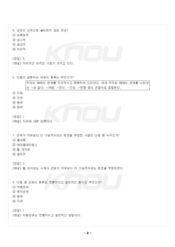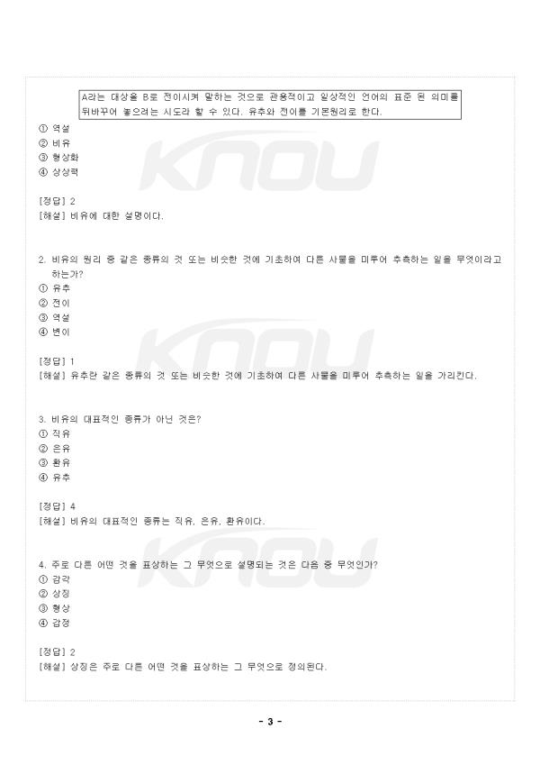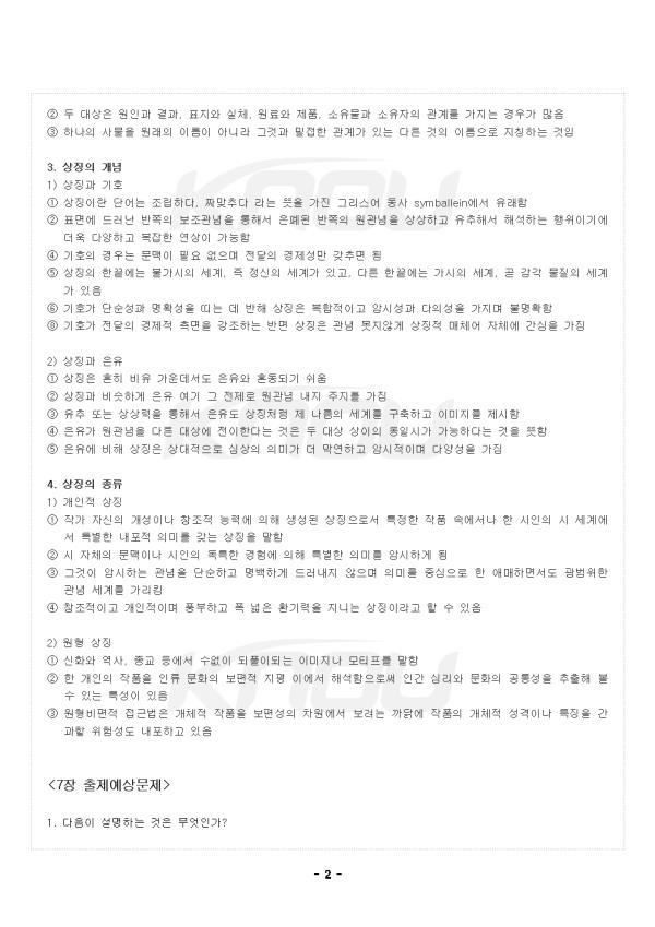 ¢ºÀÚ·á¸ñÂ÷ ¹× ÁÖÁ¦ Á¦7Àå ºñÀ¯¿Í »ó¡ Á¦8Àå ¾ÆÀÌ·¯´Ï¿Í ¿ª¼³ Á¦15Àå ½Ã ÀбâÀÇ ¹æ¹ý * °¢ À庰 ÃâÁ¦¿¹»ó¹®Á¦ Á¦°ø(ÇØ¼³Æ÷ÇÔ) * ¢ºÀÚ·á³»¿ë ¹Ì¸®º¸±â Á¦7Àå ºñÀ¯¿Í »ó¡  1. ºñÀ¯ÀÇ °³³ä°ú ¿ø¸® 1) °³³ä°ú ¿ø¸® ¨ç ºñÀ¯´Â ¸ðµç ¹®ÇÐÀû Ç¥Çö¿¡¼ °¡Àå ±âº»ÀÌ µÊ ¨è ºñÀ¯´Â ÀÏÁ¾ÀÇ È¿°úÀûÀÎ ¸»Çϱ⠹æ¹ýÀ¸·Î¼ ÀÏ»ó ¾ð¾îÀÇ Ç¥ÁØÈµÈ ¾î¹ýÀ̳ª Ç¥Çö, ÀÇ¹Ì ¸Æ¶ô µîÀ» µÚ¹Ù²Ù·Á´Â ½ÃµµÀÓ ¨é ºñÀ¯¶ó´Â ¸»Àº ±×¸®½º¾î¸¦ ¾î¿øÀ¸·Î ÇÔ ¨ê ¾î¿ø¿¡ µû¸£¸é ºñÀ¯¶õ ¾ð¾î ÀÛ¿ëÀÇ Æ¯ÀÌÇÑ ÇϳªÀÇ °áÇÕÀ¸·Î¼ ÀÌ¿¡ ÀÇÇÏ¿© ÇÑ ´ë»óÀÇ ±¹¸éÀÌ ´Ù¸¥ ´ë»óÀ¸·Î ÀüÀÌµÇ¾î¼ µÎ ¹øÂ° ´ë»óÀÌ ¸¶Ä¡ ù ¹øÂ° ´ë»óó·³ ¾Ö±âµÇ´Â °ÍÀ» °¡¸®Å´ ¨ë ¼ö»çÇÐÀ» ±â¿øÀ¸·Î µÐ´Ù´Â »ç½Ç¿¡¼ ÁüÀÛÇÒ ¼ö ÀÖµíÀÌ ºñÀ¯´Â ½Ã¿¡¼¸¸ »ç¿ëÇÏ´Â °ÍÀÌ ¾Æ´Ï¶ó ÀÏ»óÀÇ ¾ð¾î»ýȰ¿¡¼ ÀÚÁÖ »ç¿ëµÊ ¨ì ½ÃÀÎÀ̶õ Âü½ÅÇÑ ºñÀ¯, »ì¾Æ ÀÖ´Â ºñÀ¯¸¦ âÁ¶ÇÏ´Â »ç¶÷ÀÓ ¨í ºñÀ¯´Â À¯Ãß¿Í ÀüÀ̸¦ ±âº»¿ø¸®·Î ÇÔ ¨î ºñÀ¯¶õ À¯Ã߸¦ ÅëÇØ ¼·Î ´Ù¸¥ µÎ ´ë»óÀÇ À¯»ç¼ºÀ» ¹ß°ßÇÏ°í ±× °á°úÇÑ ´ë»óÀÇ Àǹ̸¦ ´Ù¸¥ ´ë»ó¿¡ ÀüÀÌÇÏ¿© Ç¥ÇöÇÏ´Â °úÁ¤¿¡¼ ¸¸µé¾îÁü ¨ï ºñÀ¯¸¦ ÅëÇØ ¼·Î ¿¬°áµÇ´Â µÎ ´ë»óÀº °¢°¢ ¿ø°ü³ä, º¸Á¶°ü³ä, ¶Ç´Â ÁÖÁö¿Í ¸Åü¶ó´Â °³³äÀ¸·Î ºÒ¸² ¨ð ¸®Ã³Áî´Â ºñÀ¯ÀÇ ¿ø¸®¸¦ ÁÖÁöÀÇ °³³äÀ¸·Î ¼³¸íÇÏ¸é¼ ÀÌ µÑÀÇ »óÈ£ ÀÛ¿ëÀ» °Á¶ÇÏ¿´À½ 2. ºñÀ¯ÀÇ Á¾·ù 1) Á÷À¯ ¨ç ÁÖÁö¿Í ¸ÅüÀÇ °ü°è¸¦ Á÷¼±ÀûÀÌ°í ¸íÈ®ÇÏ°Ô µå·¯³¿ ¨è ´ë°³ ÁÖÁö¿Í ¸ÅüÀÇ °ü°è¸¦ ³ªÅ¸³»´Â ~¿Í °°ÀÌ, ~ó·³ ~µíÀÌ, ~Àξç, ~¸¸Å µîÀÇ ¿¬°á¾î·Î °áÇÕµÊ ¨é Á÷À¯°¡ ÀºÀ¯º¸´Ù ºÐ¸íÇϰí Á÷Á¢ÀûÀ̹ǷΠ±äÀåÀÇ ¹Ðµµ³ª ÀÀÃ༺ÀÇ Á¤µµ¿¡¼ ÀºÀ¯º¸´Ù ¿µîÇÏ´Ù°í º¸´Â °ßÇØµµ ÀÖÀ¸³ª ±×·¯ÇÑ ¿ì¿ÀÇ °ü°è´Â ´ëü·Î ÀÎÁ¤µÇÁö ¾ÊÀ½ 2) ÀºÀ¯ ¨ç ġȯÀºÀ¯ - ÀºÀ¯ÀÇ ÀüÅëÀûÀ̰í ÀϹÝÀûÀÎ Çü½ÄÀÓ - º¸Á¶°ü³äÀÌ ¿ø°ü³äÀ» ´ëüÇÏ´Â ¹æ¹ý - ġȯÀºÀ¯°¡ ¼º¸³Çϱâ À§Çؼ´Â ±âÁ¸ ³¹¸»¿¡ ´ëÇÑ Ãà¾îÀû Àǹ̰¡ ÀüÁ¦µÇ¾î¾ß ÇÔ ¨è º´Ä¡ÀºÀ¯ - µÎ »ç¹° »çÀÌÀÇ »ó°ü°ü°è°¡ ¼Õ½±°Ô À¯Ãß °¡´ÉÇÑ °æ¿ì¿¡´Â µ¶ÀÚ°¡ ±äÀå°¨À» ´À³¢±â ¾î·Á¿ò - ¼ø¼öÇÏ°Ô ÀÌÁúÀûÀÎ µÎ ¿ä¼Ò¸¦ º´Ä¡½ÃÅ´ - ÀºÀ¯ÀÇ »õ·Î¿î °³³äÀÓ - º´Ä¡¿Í Á¾ÇÕ¿¡ ÀÇÇØ »õ·Î¿î Àǹ̸¦ Çü¼ºÇÏ´Â ÀºÀ¯ÀÓ - µÎ°³ÀÇ ´ë»ó »çÀÌÀÇ »ó°ü°ü°è´Â »ç½Ç»ó ÇÊ¿äÇÏÁö ¾ÊÀ½ 3) ȯÀ¯ ¨ç ÇϳªÀÇ ´ë»óÀ» ±× ´ë»ó°ú ¿¬°áµÈ Áï, ÀÎÁ¢µÈ ´ë»óÀ¸·Î Ç¥ÇöÇÏ´Â ¹æ¹ý ¨è µÎ ´ë»óÀº ¿øÀΰú °á°ú, Ç¥Áö¿Í ½Çü, ¿ø·á¿Í Á¦Ç°, ¼ÒÀ¯¹°°ú ¼ÒÀ¯ÀÚÀÇ °ü°è¸¦ °¡Áö´Â °æ¿ì°¡ ¸¹À½ ¨é ÇϳªÀÇ »ç¹°À» ¿ø·¡ÀÇ À̸§ÀÌ ¾Æ´Ï¶ó ±×°Í°ú ¹ÐÁ¢ÇÑ °ü°è°¡ ÀÖ´Â ´Ù¸¥ °ÍÀÇ À̸§À¸·Î ÁöĪÇÏ´Â °ÍÀÓ 3. »ó¡ÀÇ °³³ä 1) »ó¡°ú ±âÈ£ ¨ç »ó¡À̶õ ´Ü¾î´Â Á¶¸³ÇÏ´Ù, Â¥¸ÂÃß´Ù ¶ó´Â ¶æÀ» °¡Áø ±×¸®½º¾î µ¿»ç symballein¿¡¼ À¯·¡ÇÔ ¨è Ç¥¸é¿¡ µå·¯³ ¹ÝÂÊÀÇ º¸Á¶°ü³äÀ» ÅëÇØ¼ ÀºÆóµÈ ¹ÝÂÊÀÇ ¿ø°ü³äÀ» »ó»óÇϰí À¯ÃßÇØ¼ ÇØ¼®ÇÏ´Â ÇàÀ§À̱⿡ ´õ¿í ´Ù¾çÇÏ°í º¹ÀâÇÑ ¿¬»óÀÌ °¡´ÉÇÔ ¨ê ±âÈ£ÀÇ °æ¿ì´Â ¹®¸ÆÀÌ ÇÊ¿ä ¾øÀ¸¸ç Àü´ÞÀÇ °æÁ¦¼º¸¸ °®Ãß¸é µÊ ¨ë »ó¡ÀÇ Çѳ¡¿¡´Â ºÒ°¡½ÃÀÇ ¼¼°è, Áï Á¤½ÅÀÇ ¼¼°è°¡ ÀÖ°í, ´Ù¸¥ Çѳ¡¿¡´Â °¡½ÃÀÇ ¼¼°è, °ð °¨°¢ ¹°ÁúÀÇ ¼¼°è°¡ ÀÖÀ½ ¨ì ±âÈ£°¡ ´Ü¼ø¼º°ú ¸íÈ®¼ºÀ» ¶ì´Â µ¥ ¹ÝÇØ »ó¡Àº º¹ÇÕÀûÀÌ°í ¾Ï½Ã¼º°ú ´ÙÀǼºÀ» °¡Áö¸ç ºÒ¸íÈ®ÇÔ ¨î ±âÈ£°¡ Àü´ÞÀÇ °æÁ¦Àû Ãø¸éÀ» °Á¶ÇÏ´Â ¹Ý¸é »ó¡Àº °ü³ä ¸øÁö¾Ê°Ô »ó¡Àû ¸Åü¾î ÀÚü¿¡ °£½ÉÀ» °¡Áü 2) »ó¡°ú ÀºÀ¯ ¨ç »ó¡Àº ÈçÈ÷ ºñÀ¯ °¡¿îµ¥¼µµ ÀºÀ¯¿Í È¥µ¿µÇ±â ½¬¿ò ¨è »ó¡°ú ºñ½ÁÇÏ°Ô ÀºÀ¯ ¿©±â ±× ÀüÁ¦·Î ¿ø°ü³ä ³»Áö ÁÖÁö¸¦ °¡Áü ¨é À¯Ãß ¶Ç´Â »ó»ó·ÂÀ» ÅëÇØ¼ ÀºÀ¯µµ »ó¡ó·³ Á¦ ³ª¸§ÀÇ ¼¼°è¸¦ ±¸ÃàÇϰí À̹ÌÁö¸¦ Á¦½ÃÇÔ ¨ê ÀºÀ¯°¡ ¿ø°ü³äÀ» ´Ù¸¥ ´ë»ó¿¡ ÀüÀÌÇÑ´Ù´Â °ÍÀº µÎ ´ë»ó »óÀÌÀÇ µ¿ÀϽð¡ °¡´ÉÇÏ´Ù´Â °ÍÀ» ¶æÇÔ ¨ë ÀºÀ¯¿¡ ºñÇØ »ó¡Àº »ó´ëÀûÀ¸·Î ½É»óÀÇ Àǹ̰¡ ´õ ¸·¿¬ÇÏ°í ¾Ï½ÃÀûÀÌ¸ç ´Ù¾ç¼ºÀ» °¡Áü 4. »ó¡ÀÇ Á¾·ù 1) °³ÀÎÀû »ó¡ ¨ç ÀÛ°¡ ÀÚ½ÅÀÇ °³¼ºÀ̳ª âÁ¶Àû ´É·Â¿¡ ÀÇÇØ »ý¼ºµÈ »ó¡À¸·Î¼ ƯÁ¤ÇÑ ÀÛǰ ¼Ó¿¡¼³ª ÇÑ ½ÃÀÎÀÇ ½Ã ¼¼°è¿¡¼ Ưº°ÇÑ ³»Æ÷Àû Àǹ̸¦ °®´Â »ó¡À» ¸»ÇÔ ¨è ½Ã ÀÚüÀÇ ¹®¸ÆÀ̳ª ½ÃÀÎÀÇ µ¶Æ¯ÇÑ °æÇè¿¡ ÀÇÇØ Ưº°ÇÑ Àǹ̸¦ ¾Ï½ÃÇÏ°Ô µÊ ¨é ±×°ÍÀÌ ¾Ï½ÃÇÏ´Â °ü³äÀ» ´Ü¼øÇ