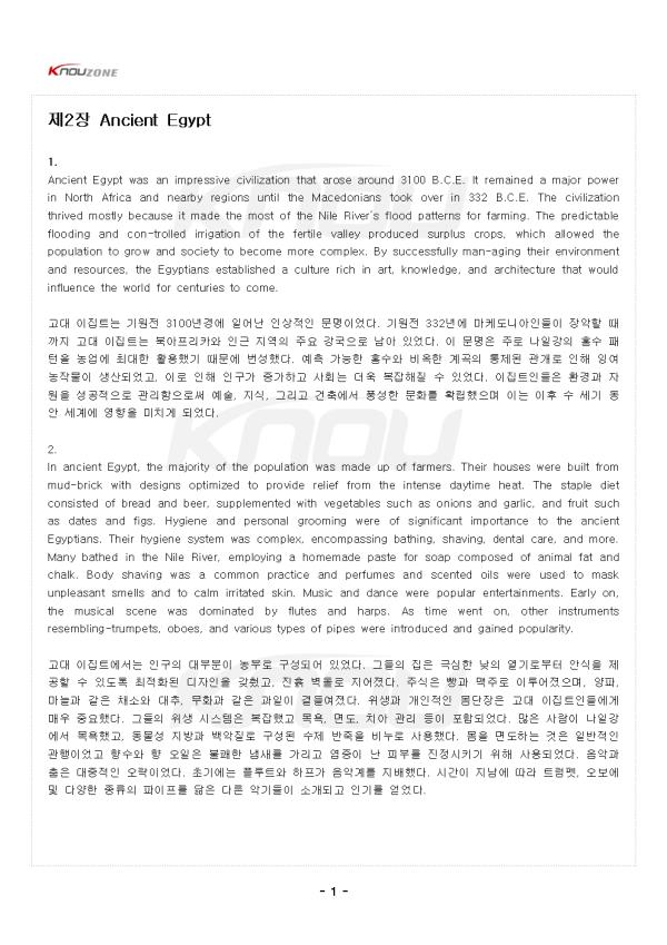 1. Ancient Egypt was an impressive civilization that arose around 3100 B.C.E. It remained a major power in North Africa and nearby regions until the Macedonians took over in 332 B.C.E. The civilization thrived mostly because it made the most of the Nile River¡¯s flood patterns for farming. The predictable flooding and con-trolled irrigation of the fertile valley produced surplus crops, which allowed the population to grow and society to become more complex. By successfully man-aging their environment and resources, the Egyptians established a culture rich in art, knowledge, and architecture that would influence the world for centuries to come. °í´ë ÀÌÁýÆ®´Â ±â¿øÀü 3100³â°æ¿¡ ÀÏ¾î³ ÀλóÀûÀÎ ¹®¸íÀ̾ú´Ù. ±â¿øÀü 332³â¿¡ ¸¶Äɵµ´Ï¾ÆÀεéÀÌ Àå¾ÇÇÒ ¶§±îÁö °í´ë ÀÌÁýÆ®´Â ºÏ¾ÆÇÁ¸®Ä«¿Í Àα٠Áö¿ªÀÇ ÁÖ¿ä °±¹À¸·Î ³²¾Æ ÀÖ¾ú´Ù. ÀÌ ¹®¸íÀº ÁÖ·Î ³ªÀϰÀÇ È«¼ö ÆÐÅÏÀ» ³ó¾÷¿¡ ÃÖ´ëÇÑ È°¿ëÇ߱⠶§¹®¿¡ ¹ø¼ºÇß´Ù. ¿¹Ãø °¡´ÉÇÑ È«¼ö¿Í ºñ¿ÁÇÑ °è°îÀÇ ÅëÁ¦µÈ °ü°³·Î ÀÎÇØ À׿© ³óÀÛ¹°ÀÌ »ý»êµÇ¾ú°í, ÀÌ·Î ÀÎÇØ Àα¸°¡ Áõ°¡ÇÏ°í »çȸ´Â ´õ¿í º¹ÀâÇØÁú ¼ö ÀÖ¾ú´Ù. ÀÌÁýÆ®ÀεéÀº ȯ°æ°ú ÀÚ¿øÀ» ¼º°øÀûÀ¸·Î °ü¸®ÇÔÀ¸·Î½á ¿¹¼ú, Áö½Ä, ±×¸®°í °ÇÃà¿¡¼ dz¼ºÇÑ ¹®È¸¦ È®¸³ÇßÀ¸¸ç ÀÌ´Â ÀÌÈÄ ¼ö ¼¼±â µ¿¾È ¼¼°è¿¡ ¿µÇâÀ» ¹ÌÄ¡°Ô µÇ¾ú´Ù. - Áß·« - [ 2Àå ÃâÁ¦¿¹»ó¹®Á¦]> ¹®Á¦ 1. ´ÙÀ½ ¹®Àå¿¡¼ (A)¿¡ µé¾î°¥ °¡Àå ÀûÀýÇÑ ´Ü¾î´Â? The civilization thrived mostly because it made the most of the Nile River's flood patterns for farming. The predictable flooding and controlled irrigation of the fertile valley produced surplus crops, which allowed the population to grow and society to become more complex. By successfully (A) their environment and resources, the Egyptians established a culture rich in art, knowledge, and architecture. ¨ç ignoring ¨è managing ¨é destroying ¨ê avoiding <ÇØ¼®> ÀÌ ¹®¸íÀº ÁÖ·Î ³ªÀϰÀÇ È«¼ö ÆÐÅÏÀ» ³ó¾÷¿¡ ÃÖ´ëÇÑ È°¿ëÇ߱⠶§¹®¿¡ ¹ø¼ºÇß´Ù. ¿¹Ãø °¡´ÉÇÑ È«¼ö¿Í ºñ¿ÁÇÑ °è°îÀÇ ÅëÁ¦µÈ °ü°³·Î ÀÎÇØ À׿© ³óÀÛ¹°ÀÌ »ý»êµÇ¾ú°í, ÀÌ·Î ÀÎÇØ Àα¸°¡ Áõ°¡ÇÏ°í »çȸ´Â ´õ¿í º¹ÀâÇØÁú ¼ö ÀÖ¾ú´Ù. ÀÌÁýÆ®ÀεéÀº ȯ°æ°ú ÀÚ¿øÀ» ¼º°øÀûÀ¸·Î (A)ÇÔÀ¸·Î½á ¿¹¼ú, Áö½Ä, ±×¸®°í °ÇÃà¿¡¼ dz¼ºÇÑ ¹®È¸¦ È®¸³Çß´Ù. <Á¤´ä> ¨è <ÇØ¼³> managingÀº '°ü¸®ÇÏ´Ù'¶ó´Â Àǹ̷Î, ÀÌÁýÆ®ÀεéÀÌ È¯°æ°ú ÀÚ¿øÀ» È¿°úÀûÀ¸·Î °ü¸®ÇÏ¿© ¹ø¿µÇÏ´Â ¹®¸íÀ» ÀÌ·èÇß´Ù´Â ³»¿ëÀÌ´Ù. ³ªÀϰÀÇ È«¼ö¸¦ ¿¹ÃøÇÏ°í °ü°³ ½Ã½ºÅÛÀ» ÅëÁ¦ÇÏ¿© ³ó¾÷ »ý»ê¼ºÀ» ³ôÀÎ °ÍÀÌ ´ëÇ¥ÀûÀÎ ¿¹ÀÌ´Ù. ignoringÀº '¹«½ÃÇÏ´Ù', destroyingÀº 'ÆÄ±«ÇÏ´Ù', avoidingÀº 'ÇÇÇÏ´Ù'·Î ¹®¸Æ»ó ÀûÀýÇÏÁö ¾Ê´Ù. °í´ë ÀÌÁýÆ® ¹®¸íÀÌ ¿À·§µ¿¾È ¹ø¼ºÇÒ ¼ö ÀÖ¾ú´ø °ÍÀº ÀÚ¿¬È¯°æÀ» Àß °ü¸®Çϰí Ȱ¿ëÇ߱⠶§¹®À̶ó´Â Á¡¿¡¼ managingÀÌ Á¤´äÀÌ´Ù. - Áß·« - |