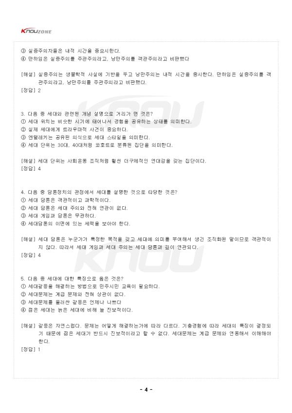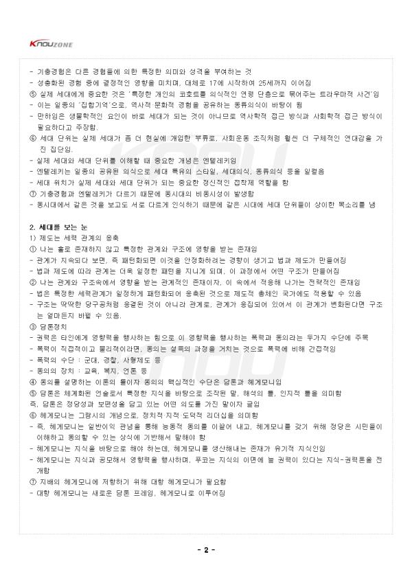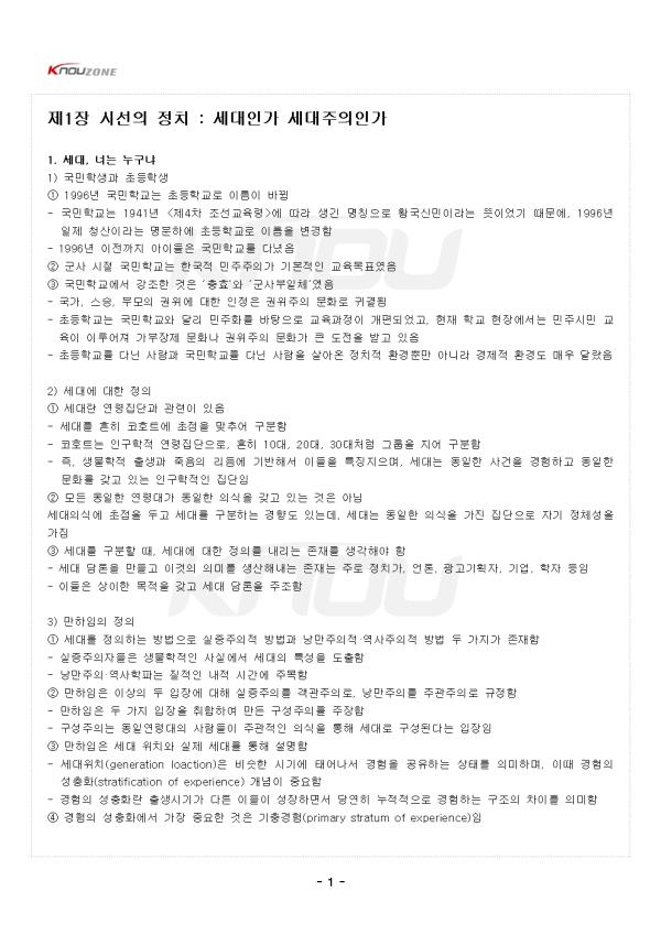 1. ¼¼´ë, ³Ê´Â ´©±¸³Ä 1) ±¹¹ÎÇлý°ú ÃʵîÇлý ¨ç 1996³â ±¹¹ÎÇб³´Â ÃʵîÇб³·Î À̸§ÀÌ ¹Ù²ñ - ±¹¹ÎÇб³´Â 1941³â <Á¦4Â÷ Á¶¼±±³À°·É>¿¡ µû¶ó »ý±ä ¸íĪÀ¸·Î Ȳ±¹½Å¹ÎÀ̶ó´Â ¶æÀ̾ú±â ¶§¹®¿¡, 1996³â ÀÏÁ¦ û»êÀ̶ó´Â ¸íºÐÇÏ¿¡ ÃʵîÇб³·Î À̸§À» º¯°æÇÔ - 1996³â ÀÌÀü±îÁö ¾ÆÀ̵éÀº ±¹¹ÎÇб³¸¦ ´Ù³æÀ½ ¨è ±º»ç ½ÃÀý ±¹¹ÎÇб³´Â Çѱ¹Àû ¹ÎÁÖÁÖÀǰ¡ ±âº»ÀûÀÎ ±³À°¸ñÇ¥¿´À½ ¨é ±¹¹ÎÇб³¿¡¼ °Á¶ÇÑ °ÍÀº ¡®ÃæÈ¿¡¯¿Í ¡®±º»çºÎÀÏü¡¯¿´À½ - ±¹°¡, ½º½Â, ºÎ¸ðÀÇ ±ÇÀ§¿¡ ´ëÇÑ ÀÎÁ¤Àº ±ÇÀ§ÁÖÀÇ ¹®È·Î ±Í°áµÊ - ÃʵîÇб³´Â ±¹¹ÎÇб³¿Í ´Þ¸® ¹ÎÁÖȸ¦ ¹ÙÅÁÀ¸·Î ±³À°°úÁ¤ÀÌ °³ÆíµÇ¾ú°í, ÇöÀç Çб³ ÇöÀå¿¡¼´Â ¹ÎÁֽùΠ±³À°ÀÌ ÀÌ·ç¾îÁ® °¡ºÎÀåÁ¦ ¹®È³ª ±ÇÀ§ÁÖÀÇ ¹®È°¡ Å« µµÀüÀ» ¹Þ°í ÀÖÀ½ - ÃʵîÇб³¸¦ ´Ù´Ñ »ç¶÷°ú ±¹¹ÎÇб³¸¦ ´Ù´Ñ »ç¶÷À» »ì¾Æ¿Â Á¤Ä¡Àû ȯ°æ»Ó¸¸ ¾Æ´Ï¶ó °æÁ¦Àû ȯ°æµµ ¸Å¿ì ´Þ¶úÀ½ 2) ¼¼´ë¿¡ ´ëÇÑ Á¤ÀÇ ¨ç ¼¼´ë¶õ ¿¬·ÉÁý´Ü°ú °ü·ÃÀÌ ÀÖÀ½ - ¼¼´ë¸¦ ÈçÈ÷ ÄÚȣƮ¿¡ ÃÊÁ¡À» ¸ÂÃß¾î ±¸ºÐÇÔ - ÄÚȣƮ´Â Àα¸ÇÐÀû ¿¬·ÉÁý´ÜÀ¸·Î, ÈçÈ÷ 10´ë, 20´ë, 30´ëó·³ ±×·ìÀ» Áö¾î ±¸ºÐÇÔ - Áï, »ý¹°ÇÐÀû Ãâ»ý°ú Á×À½ÀÇ ¸®µë¿¡ ±â¹ÝÇØ¼ À̵éÀ» Ư¡ÁöÀ¸¸ç, ¼¼´ë´Â µ¿ÀÏÇÑ »ç°ÇÀ» °æÇèÇÏ°í µ¿ÀÏÇÑ ¹®È¸¦ °®°í ÀÖ´Â Àα¸ÇÐÀûÀÎ Áý´ÜÀÓ ¨è ¸ðµç µ¿ÀÏÇÑ ¿¬·É´ë°¡ µ¿ÀÏÇÑ ÀǽÄÀ» °®°í ÀÖ´Â °ÍÀº ¾Æ´Ô ¼¼´ëÀǽĿ¡ ÃÊÁ¡À» µÎ°í ¼¼´ë¸¦ ±¸ºÐÇÏ´Â °æÇâµµ Àִµ¥, ¼¼´ë´Â µ¿ÀÏÇÑ ÀǽÄÀ» °¡Áø Áý´ÜÀ¸·Î ÀÚ±â Á¤Ã¼¼ºÀ» °¡Áü ¨é ¼¼´ë¸¦ ±¸ºÐÇÒ ¶§, ¼¼´ë¿¡ ´ëÇÑ Á¤ÀǸ¦ ³»¸®´Â Á¸À縦 »ý°¢ÇØ¾ß ÇÔ - ¼¼´ë ´ã·ÐÀ» ¸¸µé°í À̰ÍÀÇ Àǹ̸¦ »ý»êÇØ³»´Â Á¸Àç´Â ÁÖ·Î Á¤Ä¡°¡, ¾ð·Ð, ±¤°í±âȹÀÚ, ±â¾÷, ÇÐÀÚ µîÀÓ - À̵éÀº »óÀÌÇÑ ¸ñÀûÀ» °®°í ¼¼´ë ´ã·ÐÀ» ÁÖÁ¶ÇÔ 3) ¸¸ÇÏÀÓÀÇ Á¤ÀÇ ¨ç ¼¼´ë¸¦ Á¤ÀÇÇÏ´Â ¹æ¹ýÀ¸·Î ½ÇÁõÁÖÀÇÀû ¹æ¹ý°ú ³¶¸¸ÁÖÀÇÀû¡¤¿ª»çÁÖÀÇÀû ¹æ¹ý µÎ °¡Áö°¡ Á¸ÀçÇÔ - ½ÇÁõÁÖÀÇÀÚµéÀº »ý¹°ÇÐÀûÀÎ »ç½Ç¿¡¼ ¼¼´ëÀÇ Æ¯¼ºÀ» µµÃâÇÔ - ³¶¸¸ÁÖÀÇ¡¤¿ª»çÇÐÆÄ´Â ÁúÀûÀÎ ³»Àû ½Ã°£¿¡ ÁÖ¸ñÇÔ ¨è ¸¸ÇÏÀÓÀº ÀÌ»óÀÇ µÎ ÀÔÀå¿¡ ´ëÇØ ½ÇÁõÁÖÀǸ¦ °´°üÁÖÀÇ·Î, ³¶¸¸ÁÖÀǸ¦ ÁÖ°üÁÖÀÇ·Î ±ÔÁ¤ÇÔ - ¸¸ÇÏÀÓÀº µÎ °¡Áö ÀÔÀåÀ» ÃëÇÕÇÏ¿© ¸¸µç ±¸¼ºÁÖÀǸ¦ ÁÖÀåÇÔ - ±¸¼ºÁÖÀÇ´Â µ¿ÀÏ¿¬·É´ëÀÇ »ç¶÷µéÀÌ ÁÖ°üÀûÀÎ ÀǽÄÀ» ÅëÇØ ¼¼´ë·Î ±¸¼ºµÈ´Ù´Â ÀÔÀåÀÓ ¨é ¸¸ÇÏÀÓÀº ¼¼´ë À§Ä¡¿Í ½ÇÁ¦ ¼¼´ë¸¦ ÅëÇØ ¼³¸íÇÔ - ¼¼´ëÀ§Ä¡(generation loaction)Àº ºñ½ÁÇÑ ½Ã±â¿¡ ž¼ °æÇèÀ» °øÀ¯ÇÏ´Â »óŸ¦ ÀǹÌÇϸç, À̶§ °æÇèÀÇ ¼ºÃæÈ(stratification of experience) °³³äÀÌ Áß¿äÇÔ - °æÇèÀÇ ¼ºÃæÈ¶õ Ãâ»ý½Ã±â°¡ ´Ù¸¥ À̵éÀÌ ¼ºÀåÇÏ¸é¼ ´ç¿¬È÷ ´©ÀûÀûÀ¸·Î °æÇèÇÏ´Â ±¸Á¶ÀÇ Â÷À̸¦ ÀǹÌÇÔ ¨ê °æÇèÀÇ ¼ºÃæÈ¿¡¼ °¡Àå Áß¿äÇÑ °ÍÀº ±âÃæ°æÇè(primary stratum of experience)ÀÓ - Áß·« - |