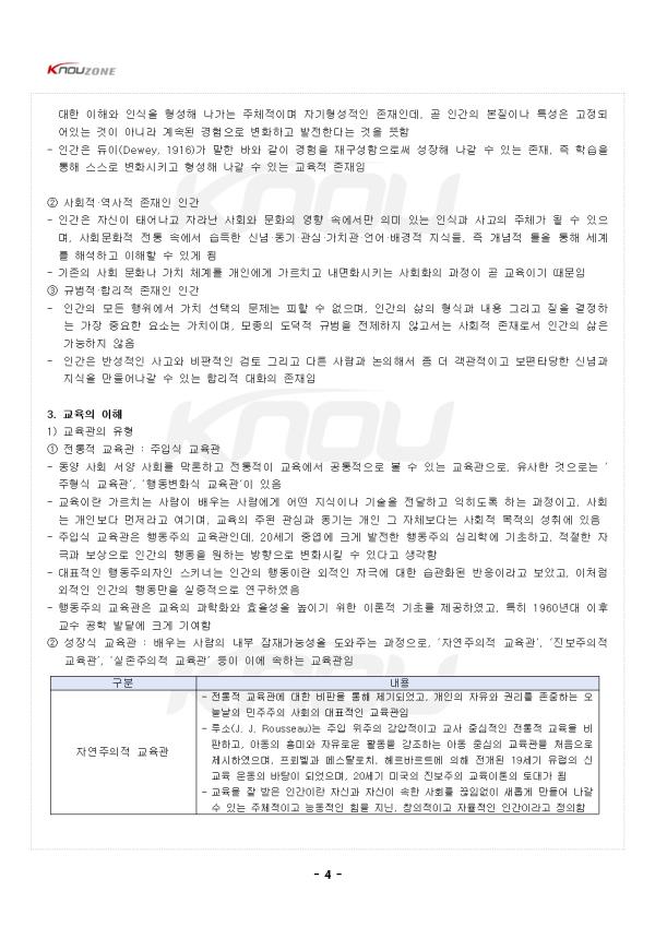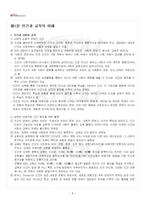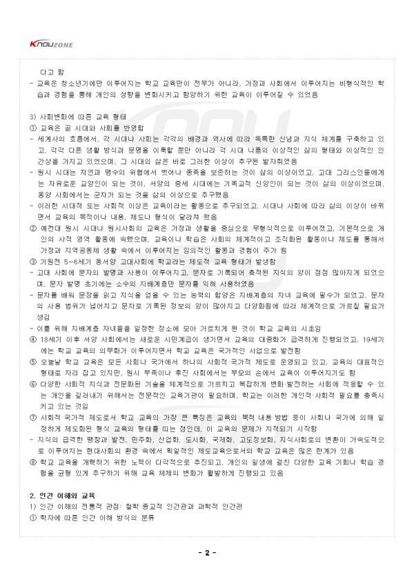 1. Àΰ£°ú »çȸ¿Í ±³À° 1) »çȸÀû¡¤±³À°Àû Á¸ÀçÀÎ Àΰ£ ¨ç Àΰ£À» ¿Ã¹Ù¸£°Ô ÀÌÇØÇÏ·Á¸é Àΰ£ÀÇ ´Ù¾çÇÑ Ãø¸é°ú °¢µµ¿¡¼ Á¾ÇÕÀûÀ¸·Î ÆÄ¾ÇÇØ¾ß Çϰí, ²÷ÀÓ¾øÀÌ »õ·Î¿î ½Ã°¢°ú Á¶¸ÁÇÏ¿¡¼ »õ·Ó°Ô ÀÌÇØÇÒ Çʿ䰡 ÀÖÀ½ ¨è ¾î¶² °üÁ¡À̳ª Á¢±Ù¹ýÀ¸·Î Àΰ£À» ÆÄ¾ÇÇϰí ÀÌÇØÇϵç Àΰ£Àº ¡®»çȸÀû Á¸À硯ÀÎ µ¿½Ã¿¡ ¡®±³À°Àû Á¸À硯ÀÓ ¨é ¡®»çȸÀû Á¸À硯¶ó´Â °ÍÀº Àΰ£ÀÌ »çȸ ¼Ó¿¡¼ ž »çȸ ¼Ó¿¡¼ ¼ºÀåÇÏ°í »çȸ ¼Ó¿¡¼ ÀÏ»ýÀ» ¸¶Ä¡°Ô µÇ´Â Á¸ÀçÀÓ - Àΰ£ÀÌ »çȸ±¸¼º¿øÀÇ Çϳª·Î¼ ¼ºÀåÇÏ¸ç »ì¾Æ°£´Ù´Â °ÍÀº ÀÚ½ÅÀÌ ÅÂ¾î³ »çȸ°¡ ÀÌ¹Ì ÃàÀûÇÑ ¹®È(¾ð¾î¿Í Áö½Ä, »ç°í¹æ½Ä°ú Çൿ¹æ½Ä)À» ³»¸éÈÇÔÀ¸·Î½á »çȸÀÇ ÀÏ¿øÀ¸·Î¼ »ì¾Æ³ª°£´Ù´Â ¶æÀÓ - Àΰ£ÀÌ ÀÚ½ÅÀÌ ¼ÓÇÑ »çȸÀÇ ¹®È¸¦ ½ÀµæÇÏ°í ³»¸éÈÇÏ´Â °úÁ¤ÀÌ °ð »çȸÈÀÇ °úÁ¤, ¶Ç´Â ±³À°ÀÇ °úÁ¤À̶ó°í ÇÔ ¨ê ¡®±³À°Àû Á¸À硯¶ó´Â °ÍÀº ±³À°È°µ¿À» ÅëÇØ¼ ÀÚ½ÅÀÌ ¼ÓÇÑ »çȸÀÇ ¹®È¸¦ ¹è¿ï ¼ö ÀÖÀ¸¸ç, ¼ºÀå°ú ¹ßÀüÀ» ÀÌ·ç¾î ³ª°¡´Â Á¸Àç¶ó´Â °ÍÀÓ - Àΰ£Àº ±³À°À» ÅëÇØ ±â¼º¼¼´ë°¡ ÃàÀûÇÑ Áö½Ä°ú °¡Ä¡°üÀ» ÇнÀÇÒ °¡´É¼ºÀÌ ÀÖ°í, ÀÌ °¡´É¼ºÀ» ¹ßÈÖÇØ Áö½Ä°ú °¡Ä¡°üÀ» ¹è¿òÀ¸·Î½á Àΰ£À¸·Î ¼ºÀå°ú ¹ßÀüÀ» ÀÌ·ç¾î ³ª°¡´Â Á¸ÀçÀÓ - Àΰ£ÀÌ ÈÄõÀûÀÎ ÇнÀ°ú °æÇèÀ» ÅëÇØ ¼ºÀå°ú ¹ßÀüÀ» ÀÌ·ç¾î ³ª°¡´Â Á¸ÀçÀÎ ÀÌÀ¯·Î Àΰ£À» ±³À°Àû Á¸Àç, µµ´Â ÇнÀÀû Á¸Àç¶ó°í ÇÔ - Àΰ£Àº ÀÚ½ÅÀÇ °æÇèÀ» ¹ÙÅÁÀ¸·Î ½º½º·Î Çü¼ºÇØ ³ª°¡´Â ¡®ÀÚ±âÇü¼ºÀû Á¸À硯·Î, ž ¶§ ¿Ï¼ºµÈ Á¸Àç°¡ ¾Æ´Ï¶ó °æÇè°ú ÇнÀÀ¸·Î º¯ÈÇÏ°í ¼ºÀåÇϰí Çü¼ºµÇ´Â Á¸Àç, ÀÌ¹Ì ¾î¶² ÇüÅ·Π±ÔÁ¤µÇ°Å³ª ¿Ï¼ºµÈ Á¸Àç°¡ ¾Æ´Ï¶ó ¹Ì¿ÏÀÇ Á¸ÀçÀ̸ç, °èȹ°ú ÀÇÁö¿¡ µû¶ó Çü¼º½Ãų ¼ö ÀÖ´Â Á¸ÀçÀÓ 2) ±³À°Àº ¹Ù¶÷Á÷ÇÑ Àΰ£ Çü¼ºÀ» À§ÇÑ È°µ¿ ¨ç Àΰ£ÀÇ »î¿¡¼ ±³À°ÀÇ Àǹ̴ ¡®°¡´É¼º°ú ¼ºÀåÀÇ Á¸À硯 ¶Ç´Â ¡®±³À°Àû Á¸À硯ÀÎ Àΰ£ÀÇ Æ¯¼º°ú °ü·ÃÀÖ°í, Àΰ£À¸·Î¼ °¡´É¼º°ú ¼ºÀåÀ» ½ÇÇöÇØ ³ª°¡·Á¸é »çȸÀû Ȱµ¿ÀÎ ±³À° Ȱµ¿ÀÌ ÀÖ¾î¾ß Çϸç, ÀÌ·¯ÇÑ ÀÌÀ¯·Î Àΰ£°ú »çȸ¿Í ±³À°ÀÇ °ü°è´Â ºÒ°¡ºÐÀÇ °ü°èÀÓ ¨è ÄÆ® ¡°±³À°ÀÌ »ç¶÷À» »ç¶÷´ä°Ô ¸¸µç´Ù¡®¶ó°í ¸»ÇßµíÀÌ, ±³À°Àº Àΰ£ Çü¼ºÀÇ °úÁ¤ÀÓ ¨é ±³À°À¸·Î ½ÇÇöÇØ¾ß ÇÒ ¹Ù¶÷Á÷ÇÑ Àΰ£»óÀº »çȸ³ª ¹®È ¶Ç´Â ½Ã´ë¿¡ µû¶ó ´Ù¸¥ ´äÀÌ Á¦½ÃµÇ´Âµ¥, ±× »çȸ°¡ Ãß±¸ÇÏ´Â °¡Ä¡°ü¿¡ µû¶ó ±³À°ÀÇ ¸ñÀû°ú ³»¿ë°ú ¹æ¹ýÀÌ °áÁ¤µÇ±â ¶§¹®ÀÓ ¨ê ±³À°ÀÇ ¸ñÇ¥´Â Àΰ£ÀÇ °¡Ä¡°ü°ú Áö½Ä, °æÇè, Çൿ, ¼º°Ý µîÀÇ ¼ºÇâ(³»ÀûÁ¶°Ç)À» ¹Ù¶÷Á÷ÇÑ ¹æÇâÀ¸·Î ¹Ù²Ù´Â °ÍÀ̰í, ±³À°Àº ¹Ù¶÷Á÷ÇÑ ¼ºÇâÀ» ÇÔ¾çÇϴ Ȱµ¿ÀÓ - Àΰ£Àº ´Ù¾çÇÑ Á¾·ùÀÇ ¼ºÇâÀÌ Àִµ¥, Áö(ò±), Á¤(ï×), ÀÇ(ëò), ü(ô÷) µîÀ¸·Î ºÐ·ùÇϱ⵵ ÇÏÁö¸¸, ÀÌ¿Í °°Àº ¼ºÇâµéÀÌ Á¾ÇÕÀûÀÌ¸ç ±ÕÇüÀûÀ¸·Î ¹ßÀüµÇ¾úÀ» ¶§ ÀüÀÎÀû(îïìÑîÜ) Àΰ£À¸·Î¼ ¹Ù¶÷Á÷ÇÑ ¹ß´ÞÀ» ÀÌ·é °ÍÀ¸·Î µ¿¼¾çÀ» ¸··ÐÇϰí ÀüÅëÀûÀ¸·Î »ý°¢µÊ - ÀüÅë¿¡ µû¶ó ±³À°µµ Áö(ò±), Á¤(ï×), ÀÇ(ëò), ü(ô÷)°¡ °ñ°í·ç ¹ß´ÞÇÑ ÀüÀÎÀû Àΰ£ Çü¼ºÀ» ¸ñÇ¥·Î Ãß±¸Çß°í, ±³À°Àº Àΰ£ÀÇ ÀÏ»ý Áß ¾î´À ƯÁ¤ ½Ã±â¿¡ ÇÑÁ¤Çؼ ÀÌ·ç¾îÁö°Å³ª ¿Ï°áµÇ´Â °ÍÀÌ ¾Æ´Ï¸ç, ´Ù¾çÇÑ Àΰ£ ¼ºÇâ Áß ¾î´À ÇÑ ºÎºÐÀÇ ¼ºÇ⸸ ¹ß´Þ½ÃÄѼ ¿Ï¼ºµÇ´Â °ÍÀÌ ¾Æ´Ô ¨ë µàÀÌ(J. Dewey)´Â Àΰ£ÀÇ »îÀº »õ·Î¿î °æÇèÀÇ °úÁ¤À̸ç, »õ·Î¿î °æÇèÀ¸·Î °è¼Ó ¼ºÀåÇÏÁö ¸øÇÏ´Â »îÀº ÀÌ¹Ì »ì¾Æ ÀÖ´Â »îÀÌ ¾Æ´Ï¶ó°í Çß°í, ±³À°Àº °ð »õ·Î¿î °æÇè ¼Ó¿¡¼ ²÷ÀÓ¾øÀÌ ¼ºÀåÀ» ÀÌ·ç¾î °¡´Â Ȱµ¿À» ¶æÇÑ´Ù°í ÇÔ - ±³À°Àº û¼Ò³â±â¿¡¸¸ ÀÌ·ç¾îÁö´Â Çб³ ±³À°¸¸ÀÌ ÀüºÎ°¡ ¾Æ´Ï¶ó, °¡Á¤°ú »çȸ¿¡¼ ÀÌ·ç¾îÁö´Â ºñÇü½ÄÀûÀÎ ÇнÀ°ú °æÇèÀ» ÅëÇØ °³ÀÎÀÇ ¼ºÇâÀ» º¯È½Ã۰í ÇÔ¾çÇϱâ À§ÇÑ ±³À°ÀÌ ÀÌ·ç¾îÁú ¼ö ÀÖ¾úÀ½ 3) »çȸº¯È¿¡ µû¸¥ ±³À° ÇüÅ ¨ç ±³À°Àº °ð ½Ã´ë¿Í »çȸ¸¦ ¹Ý¿µÇÔ - ¼¼°è»çÀÇ È帧¿¡¼, °¢ ½Ã´ë³ª »çȸ´Â °¢°¢ÀÇ ¹è°æ°ú ¿ª»ç¿¡ µû¶ó µ¶Æ¯ÇÑ ½Å³ä°ú Áö½Ä ü°è¸¦ ±¸ÃàÇϰí ÀÖ°í, °¢°¢ ´Ù¸¥ »ýȰ ¹æ½Ä°ú ¹®¸íÀ» ÀÌ·èÇÒ »Ó¸¸ ¾Æ´Ï¶ó °¢ ½Ã´ë ³ª¸§ÀÇ ÀÌ»óÀûÀÎ »îÀÇ ÇüÅÂ¿Í ÀÌ»óÀûÀÎ Àΰ£»óÀ» °¡Áö°í ÀÖ¾úÀ¸¸ç, ±× ½Ã´ëÀÇ »îÀº ¹Ù·Î ±×·¯ÇÑ ÀÌ»óÀÌ Ãß±¸µÈ ¹ßÀÚÃë¿´À½ - ¿ø½Ã ½Ã´ë´Â ÀÚ¿¬°ú ¸Í¼öÀÇ À§Çù¿¡¼ ¹þ¾î³ª Á¾Á·À» º¸Á¸ÇÏ´Â °ÍÀÌ »îÀÇ ÀÌ»óÀ̾ú°í, °í´ë ±×¸®½ºÀε鿡°Ô´Â ÀÚÀ¯·Î¿î ±³¾çÀÎÀÌ µÇ´Â °ÍÀÌ, ¼¾çÀÇ