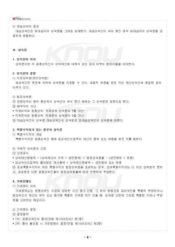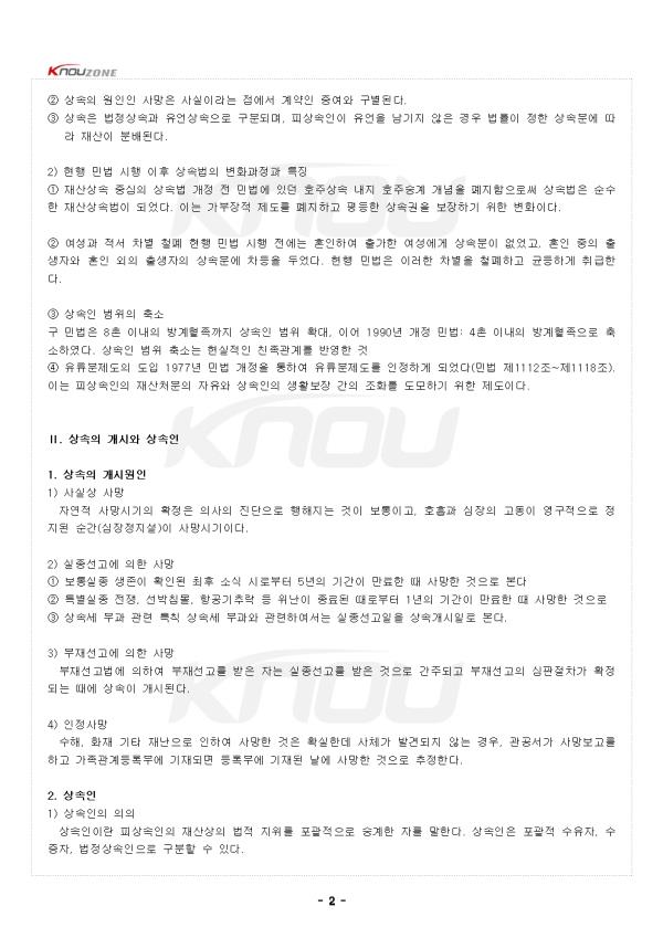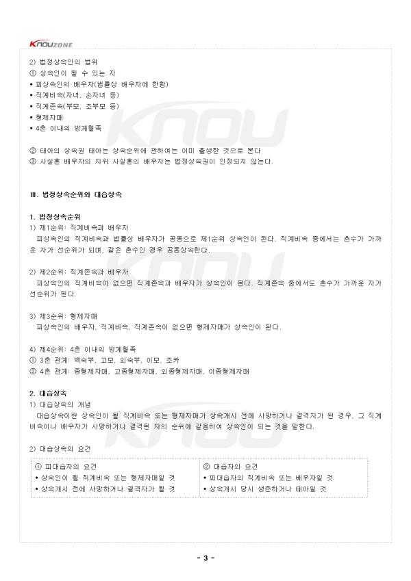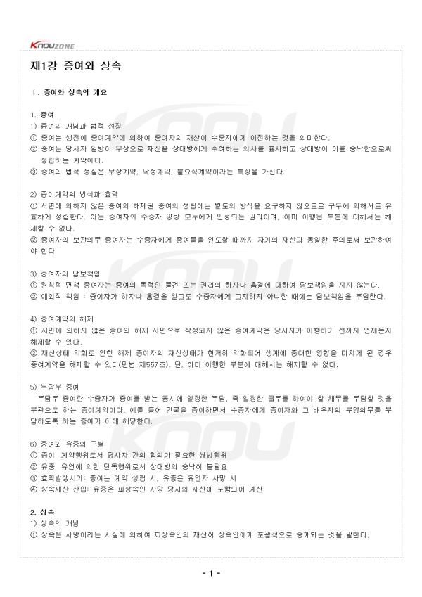 ¥°. Áõ¿©¿Í »ó¼ÓÀÇ °³¿ä 1. Áõ¿© 1) Áõ¿©ÀÇ °³³ä°ú ¹ýÀû ¼ºÁú ¨ç Áõ¿©´Â »ýÀü¿¡ Áõ¿©°è¾à¿¡ ÀÇÇÏ¿© Áõ¿©ÀÚÀÇ Àç»êÀÌ ¼öÁõÀÚ¿¡°Ô ÀÌÀüÇÏ´Â °ÍÀ» ÀǹÌÇÑ´Ù. ¨è Áõ¿©´Â ´ç»çÀÚ ÀϹæÀÌ ¹«»óÀ¸·Î Àç»êÀ» »ó´ë¹æ¿¡°Ô ¼ö¿©ÇÏ´Â Àǻ縦 Ç¥½ÃÇÏ°í »ó´ë¹æÀÌ À̸¦ ½Â³«ÇÔÀ¸·Î½á ¼º¸³ÇÏ´Â °è¾àÀÌ´Ù. ¨é Áõ¿©ÀÇ ¹ýÀû ¼ºÁúÀº ¹«»ó°è¾à, ³«¼º°è¾à, ºÒ¿ä½Ä°è¾àÀ̶ó´Â Ư¡À» °¡Áø´Ù. 2) Áõ¿©°è¾àÀÇ ¹æ½Ä°ú È¿·Â ¨ç ¼¸é¿¡ ÀÇÇÏÁö ¾ÊÀº Áõ¿©ÀÇ ÇØÁ¦±Ç Áõ¿©ÀÇ ¼º¸³¿¡´Â º°µµÀÇ ¹æ½ÄÀ» ¿ä±¸ÇÏÁö ¾ÊÀ¸¹Ç·Î ±¸µÎ¿¡ ÀÇÇØ¼µµ À¯È¿ÇÏ°Ô ¼º¸³ÇÑ´Ù. ÀÌ´Â Áõ¿©ÀÚ¿Í ¼öÁõÀÚ ¾ç¹æ ¸ðµÎ¿¡°Ô ÀÎÁ¤µÇ´Â ±Ç¸®À̸ç, ÀÌ¹Ì ÀÌÇàµÈ ºÎºÐ¿¡ ´ëÇØ¼´Â ÇØÁ¦ÇÒ ¼ö ¾ø´Ù. ¨è Áõ¿©ÀÚÀÇ º¸°üÀǹ« Áõ¿©ÀÚ´Â ¼öÁõÀÚ¿¡°Ô Áõ¿©¹°À» ÀεµÇÒ ¶§±îÁö ÀÚ±âÀÇ Àç»ê°ú µ¿ÀÏÇÑ ÁÖÀÇ·Î½á º¸°üÇÏ¿©¾ß ÇÑ´Ù. 3) Áõ¿©ÀÚÀÇ ´ãº¸Ã¥ÀÓ ¨ç ¿øÄ¢Àû ¸éÃ¥ Áõ¿©ÀÚ´Â Áõ¿©ÀÇ ¸ñÀûÀÎ ¹°°Ç ¶Ç´Â ±Ç¸®ÀÇ ÇÏÀÚ³ª Èì°á¿¡ ´ëÇÏ¿© ´ãº¸Ã¥ÀÓÀ» ÁöÁö ¾Ê´Â´Ù. ¨è ¿¹¿ÜÀû Ã¥ÀÓ : Áõ¿©ÀÚ°¡ ÇÏÀÚ³ª Èì°áÀ» ¾Ë°íµµ ¼öÁõÀÚ¿¡°Ô °íÁöÇÏÁö ¾Æ´ÏÇÑ ¶§¿¡´Â ´ãº¸Ã¥ÀÓÀ» ºÎ´ãÇÑ´Ù. 4) Áõ¿©°è¾àÀÇ ÇØÁ¦ ¨ç ¼¸é¿¡ ÀÇÇÏÁö ¾ÊÀº Áõ¿©ÀÇ ÇØÁ¦ ¼¸éÀ¸·Î ÀÛ¼ºµÇÁö ¾ÊÀº Áõ¿©°è¾àÀº ´ç»çÀÚ°¡ ÀÌÇàÇϱâ Àü±îÁö ¾ðÁ¦µçÁö ÇØÁ¦ÇÒ ¼ö ÀÖ´Ù. ¨è Àç»ê»óÅ ¾ÇÈ·Î ÀÎÇÑ ÇØÁ¦ Áõ¿©ÀÚÀÇ Àç»ê»óŰ¡ ÇöÀúÈ÷ ¾ÇÈµÇ¾î »ý°è¿¡ Áß´ëÇÑ ¿µÇâÀ» ¹ÌÄ¡°Ô µÈ °æ¿ì Áõ¿©°è¾àÀ» ÇØÁ¦ÇÒ ¼ö ÀÖ´Ù(¹Î¹ý Á¦557Á¶). ´Ü, ÀÌ¹Ì ÀÌÇàÇÑ ºÎºÐ¿¡ ´ëÇØ¼´Â ÇØÁ¦ÇÒ ¼ö ¾ø´Ù. 5) ºÎ´ãºÎ Áõ¿© ºÎ´ãºÎ Áõ¿©¶õ ¼öÁõÀÚ°¡ Áõ¿©¸¦ ¹Þ´Â µ¿½Ã¿¡ ÀÏÁ¤ÇÑ ºÎ´ã, Áï ÀÏÁ¤ÇÑ ±ÞºÎ¸¦ ÇÏ¿©¾ß ÇÒ Ã¤¹«¸¦ ºÎ´ãÇÒ °ÍÀ» ºÎ°üÀ¸·Î ÇÏ´Â Áõ¿©°è¾àÀÌ´Ù. ¿¹¸¦ µé¾î °Ç¹°À» Áõ¿©ÇÏ¸é¼ ¼öÁõÀÚ¿¡°Ô Áõ¿©ÀÚ¿Í ±× ¹è¿ìÀÚÀÇ ºÎ¾çÀǹ«¸¦ ºÎ´ãÇϵµ·Ï ÇÏ´Â Áõ¿©°¡ ÀÌ¿¡ ÇØ´çÇÑ´Ù. 6) Áõ¿©¿Í À¯ÁõÀÇ ±¸º° ¨ç Áõ¿©: °è¾àÇàÀ§·Î¼ ´ç»çÀÚ °£ÀÇ ÇÕÀǰ¡ ÇÊ¿äÇÑ ½Ö¹æÇàÀ§ ¨è À¯Áõ: À¯¾ð¿¡ ÀÇÇÑ ´Üµ¶ÇàÀ§·Î¼ »ó´ë¹æÀÇ ½Â³«ÀÌ ºÒÇÊ¿ä ¨é È¿·Â¹ß»ý½Ã±â: Áõ¿©´Â °è¾à ¼º¸³ ½Ã, À¯ÁõÀº À¯¾ðÀÚ »ç¸Á ½Ã ¨ê »ó¼ÓÀç»ê »êÀÔ: À¯ÁõÀº ÇÇ»ó¼ÓÀÎ »ç¸Á ´ç½ÃÀÇ Àç»ê¿¡ Æ÷ÇÔµÇ¾î °è»ê 2. »ó¼Ó 1) »ó¼ÓÀÇ °³³ä ¨ç »ó¼ÓÀº »ç¸ÁÀ̶ó´Â »ç½Ç¿¡ ÀÇÇÏ¿© ÇÇ»ó¼ÓÀÎÀÇ Àç»êÀÌ »ó¼ÓÀο¡°Ô Æ÷°ýÀûÀ¸·Î ½Â°èµÇ´Â °ÍÀ» ¸»ÇÑ´Ù. ¨è »ó¼ÓÀÇ ¿øÀÎÀÎ »ç¸ÁÀº »ç½ÇÀ̶ó´Â Á¡¿¡¼ °è¾àÀÎ Áõ¿©¿Í ±¸º°µÈ´Ù. ¨é »ó¼ÓÀº ¹ýÁ¤»ó¼Ó°ú À¯¾ð»ó¼ÓÀ¸·Î ±¸ºÐµÇ¸ç, ÇÇ»ó¼ÓÀÎÀÌ À¯¾ðÀ» ³²±âÁö ¾ÊÀº °æ¿ì ¹ý·üÀÌ Á¤ÇÑ »ó¼ÓºÐ¿¡ µû¶ó Àç»êÀÌ ºÐ¹èµÈ´Ù. 2) ÇöÇà ¹Î¹ý ½ÃÇà ÀÌÈÄ »ó¼Ó¹ýÀÇ º¯È°úÁ¤°ú Ư¡ ¨ç Àç»ê»ó¼Ó Áß½ÉÀÇ »ó¼Ó¹ý °³Á¤ Àü ¹Î¹ý¿¡ ÀÖ´ø È£ÁÖ»ó¼Ó ³»Áö È£ÁÖ½Â°è °³³äÀ» ÆóÁöÇÔÀ¸·Î½á »ó¼Ó¹ýÀº ¼ø¼öÇÑ Àç»ê»ó¼Ó¹ýÀÌ µÇ¾ú´Ù. ÀÌ´Â °¡ºÎÀåÀû Á¦µµ¸¦ ÆóÁöÇÏ°í ÆòµîÇÑ »ó¼Ó±ÇÀ» º¸ÀåÇϱâ À§ÇÑ º¯ÈÀÌ´Ù. ¨è ¿©¼º°ú Àû¼ Â÷º° öÆó ÇöÇà ¹Î¹ý ½ÃÇà Àü¿¡´Â È¥ÀÎÇÏ¿© Ãâ°¡ÇÑ ¿©¼º¿¡°Ô »ó¼ÓºÐÀÌ ¾ø¾ú°í, È¥ÀÎ ÁßÀÇ Ãâ»ýÀÚ¿Í È¥ÀÎ ¿ÜÀÇ Ãâ»ýÀÚÀÇ »ó¼ÓºÐ¿¡ Â÷µîÀ» µÎ¾ú´Ù. ÇöÇà ¹Î¹ýÀº ÀÌ·¯ÇÑ Â÷º°À» öÆóÇÏ°í ±ÕµîÇÏ°Ô Ãë±ÞÇÑ´Ù. ¨é »ó¼ÓÀÎ ¹üÀ§ÀÇ Ãà¼Ò ±¸ ¹Î¹ýÀº 8ÃÌ À̳»ÀÇ ¹æ°èÇ÷Á·±îÁö »ó¼ÓÀÎ ¹üÀ§ È®´ë, À̾î 1990³â °³Á¤ ¹Î¹ý: 4ÃÌ À̳»ÀÇ ¹æ°èÇ÷Á·À¸·Î Ãà¼ÒÇÏ¿´´Ù. »ó¼ÓÀÎ ¹üÀ§ Ãà¼Ò´Â Çö½ÇÀûÀΠģÁ·°ü°è¸¦ ¹Ý¿µÇÑ °Í ¨ê À¯·ùºÐÁ¦µµÀÇ µµÀÔ 1977³â ¹Î¹ý °³Á¤À» ÅëÇÏ¿© À¯·ùºÐÁ¦µµ¸¦ ÀÎÁ¤ÇÏ°Ô µÇ¾ú´Ù(¹Î¹ý Á¦1112Á¶~Á¦1118Á¶). ÀÌ´Â ÇÇ»ó¼ÓÀÎÀÇ Àç»êóºÐÀÇ ÀÚÀ¯¿Í »ó¼ÓÀÎÀÇ »ýȰº¸Àå °£ÀÇ Á¶È¸¦ µµ¸ðÇϱâ À§ÇÑ Á¦µµÀÌ´Ù. ¥±. »ó¼ÓÀÇ °³½Ã¿Í »ó¼ÓÀÎ 1. »ó¼ÓÀÇ °³½Ã¿øÀÎ 1) »ç½Ç»ó »ç¸Á ÀÚ¿¬Àû »ç¸Á½Ã±âÀÇ È®Á¤Àº ÀÇ»çÀÇ Áø´ÜÀ¸·Î ÇàÇØÁö´Â °ÍÀÌ º¸ÅëÀ̰í, È£Èí°ú ½ÉÀåÀÇ °íµ¿ÀÌ ¿µ±¸ÀûÀ¸·Î Á¤ÁöµÈ ¼ø°£(½ÉÀåÁ¤Áö¼³)ÀÌ »ç¸Á½Ã±âÀÌ´Ù. 2) ½ÇÁ¾¼±°í¿¡ ÀÇÇÑ »ç¸Á ¨ç º¸Åë½ÇÁ¾ »ýÁ¸ÀÌ È®ÀÎµÈ ÃÖÈÄ ¼Ò½Ä ½Ã·ÎºÎÅÍ 5³âÀÇ ±â°£ÀÌ ¸¸·áÇÑ ¶§ »ç¸ÁÇÑ °ÍÀ¸·Î º»´Ù ¨è Ưº°½ÇÁ¾ ÀüÀï, ¼±¹Úħ¸ô, Ç×°ø±âÃß¶ô µî À§³ÀÌ Á¾·áµÈ ¶§·ÎºÎÅÍ 1³âÀÇ ±â°£ÀÌ ¸¸·áÇÑ ¶§ »ç¸ÁÇÑ °ÍÀ¸·Î ¨é »ó¼Ó¼¼ ºÎ°ú °ü·Ã ƯĢ »ó¼Ó¼¼ ºÎ°ú¿Í °ü·Ã