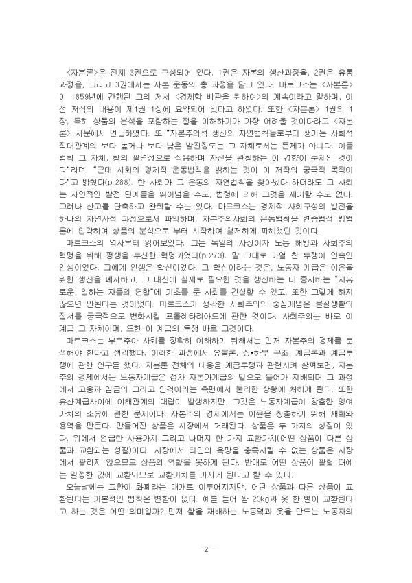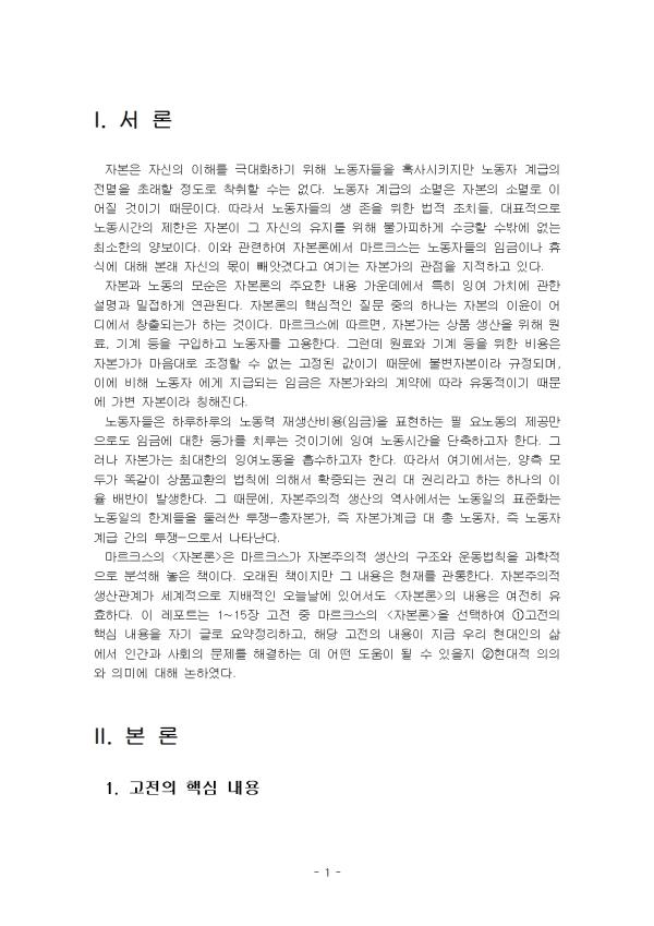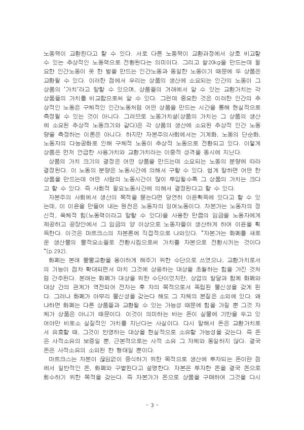 ÀÚº»Àº ÀÚ½ÅÀÇ ÀÌÇØ¸¦ ±Ø´ëÈÇϱâ À§ÇØ ³ëµ¿ÀÚµéÀ» Ȥ»ç½ÃŰÁö¸¸ ³ëµ¿ÀÚ °è±ÞÀÇ Àü¸êÀ» ÃÊ·¡ÇÒ Á¤µµ·Î ÂøÃëÇÒ ¼ö´Â ¾ø´Ù. ³ëµ¿ÀÚ °è±ÞÀÇ ¼Ò¸êÀº ÀÚº»ÀÇ ¼Ò¸ê·Î À̾îÁú °ÍÀ̱⠶§¹®ÀÌ´Ù. µû¶ó¼ ³ëµ¿ÀÚµéÀÇ »ý Á¸À» À§ÇÑ ¹ýÀû Á¶Ä¡µé, ´ëÇ¥ÀûÀ¸·Î ³ëµ¿½Ã°£ÀÇ Á¦ÇÑÀº ÀÚº»ÀÌ ±× ÀÚ½ÅÀÇ À¯Áö¸¦ À§ÇØ ºÒ°¡ÇÇÇÏ°Ô ¼ö±àÇÒ ¼ö¹Û¿¡ ¾ø´Â ÃÖ¼ÒÇÑÀÇ ¾çº¸ÀÌ´Ù. ÀÌ¿Í °ü·ÃÇÏ¿© ÀÚº»·Ð¿¡¼ ¸¶¸£Å©½º´Â ³ëµ¿ÀÚµéÀÇ ÀÓ±ÝÀ̳ª È޽Ŀ¡ ´ëÇØ º»·¡ ÀÚ½ÅÀÇ ¸òÀÌ »©¾Ñ°å´Ù°í ¿©±â´Â ÀÚº»°¡ÀÇ °üÁ¡À» ÁöÀûÇϰí ÀÖ´Ù. ÀÚº»°ú ³ëµ¿ÀÇ ¸ð¼øÀº ÀÚº»·ÐÀÇ ÁÖ¿äÇÑ ³»¿ë °¡¿îµ¥¿¡¼ ƯÈ÷ À׿© °¡Ä¡¿¡ °üÇÑ ¼³¸í°ú ¹ÐÁ¢ÇÏ°Ô ¿¬°üµÈ´Ù. ÀÚº»·ÐÀÇ ÇÙ½ÉÀûÀÎ Áú¹® ÁßÀÇ Çϳª´Â ÀÚº»ÀÇ ÀÌÀ±ÀÌ ¾îµð¿¡¼ âÃâµÇ´Â°¡ ÇÏ´Â °ÍÀÌ´Ù. ¸¶¸£Å©½º¿¡ µû¸£¸é, ÀÚº»°¡´Â »óǰ »ý»êÀ» À§ÇØ ¿ø·á, ±â°è µîÀ» ±¸ÀÔÇÏ°í ³ëµ¿ÀÚ¸¦ °í¿ëÇÑ´Ù. ±×·±µ¥ ¿ø·á¿Í ±â°è µîÀ» À§ÇÑ ºñ¿ëÀº ÀÚº»°¡°¡ ¸¶À½´ë·Î Á¶Á¤ÇÒ ¼ö ¾ø´Â °íÁ¤µÈ °ªÀ̱⠶§¹®¿¡ ºÒº¯ÀÚº»À̶ó ±ÔÁ¤µÇ¸ç, ÀÌ¿¡ ºñÇØ ³ëµ¿ÀÚ ¿¡°Ô Áö±ÞµÇ´Â ÀÓ±ÝÀº ÀÚº»°¡¿ÍÀÇ °è¾à¿¡ µû¶ó À¯µ¿ÀûÀ̱⠶§¹®¿¡ °¡º¯ ÀÚº»À̶ó ÄªÇØÁø´Ù. ³ëµ¿ÀÚµéÀº ÇÏ·çÇÏ·çÀÇ ³ëµ¿·Â Àç»ý»êºñ¿ë(ÀÓ±Ý)À» Ç¥ÇöÇÏ´Â ÇÊ ¿ä³ëµ¿ÀÇ Á¦°ø¸¸À¸·Îµµ Àӱݿ¡ ´ëÇÑ µî°¡¸¦ Ä¡·ç´Â °ÍÀ̱⿡ À׿© ³ëµ¿½Ã°£À» ´ÜÃàÇϰíÀÚ ÇÑ´Ù. ±×·¯³ª ÀÚº»°¡´Â ÃÖ´ëÇÑÀÇ À׿©³ëµ¿À» Èí¼öÇϰíÀÚ ÇÑ´Ù. µû¶ó¼ ¿©±â¿¡¼´Â, ¾çÃø ¸ðµÎ°¡ ¶È°°ÀÌ »óǰ±³È¯ÀÇ ¹ýÄ¢¿¡ ÀÇÇØ¼ È®ÁõµÇ´Â ±Ç¸® ´ë ±Ç¸®¶ó°í ÇÏ´Â ÇϳªÀÇ ÀÌÀ² ¹è¹ÝÀÌ ¹ß»ýÇÑ´Ù. ±× ¶§¹®¿¡, ÀÚº»ÁÖÀÇÀû »ý»êÀÇ ¿ª»ç¿¡¼´Â ³ëµ¿ÀÏÀÇ Ç¥ÁØÈ´Â ³ëµ¿ÀÏÀÇ ÇѰèµéÀ» µÑ·¯½Ñ ÅõÀÃÑÀÚº»°¡, Áï ÀÚº»°¡°è±Þ ´ë ÃÑ ³ëµ¿ÀÚ, Áï ³ëµ¿ÀÚ°è±Þ °£ÀÇ ÅõÀÀ¸·Î¼ ³ªÅ¸³´Ù. ¸¶¸£Å©½ºÀÇ <ÀÚº»·Ð>Àº ¸¶¸£Å©½º°¡ ÀÚº»ÁÖÀÇÀû »ý»êÀÇ ±¸Á¶¿Í ¿îµ¿¹ýÄ¢À» °úÇÐÀûÀ¸·Î ºÐ¼®ÇØ ³õÀº Ã¥ÀÌ´Ù. ¿À·¡µÈ Ã¥ÀÌÁö¸¸ ±× ³»¿ëÀº ÇöÀ縦 °üÅëÇÑ´Ù. ÀÚº»ÁÖÀÇÀû »ý»ê°ü°è°¡ ¼¼°èÀûÀ¸·Î Áö¹èÀûÀÎ ¿À´Ã³¯¿¡ À־µ <ÀÚº»·Ð>ÀÇ ³»¿ëÀº ¿©ÀüÈ÷ À¯È¿ÇÏ´Ù. ÀÌ ·¹Æ÷Æ®´Â 1~15Àå °íÀü Áß ¸¶¸£Å©½ºÀÇ <ÀÚº»·Ð>À» ¼±ÅÃÇÏ¿© ¨ç°íÀüÀÇ ÇÙ½É ³»¿ëÀ» Àڱ⠱۷Π¿ä¾àÁ¤¸®Çϰí, ÇØ´ç °íÀüÀÇ ³»¿ëÀÌ Áö±Ý ¿ì¸® Çö´ëÀÎÀÇ »î¿¡¼ Àΰ£°ú »çȸÀÇ ¹®Á¦¸¦ ÇØ°áÇÏ´Â µ¥ ¾î¶² µµ¿òÀÌ µÉ ¼ö ÀÖÀ»Áö ¨èÇö´ëÀû ÀÇÀÇ¿Í Àǹ̿¡ ´ëÇØ ³íÇÏ¿´´Ù. II. º» ·Ð 1. °íÀüÀÇ ÇÙ½É ³»¿ë <ÀÚº»·Ð>Àº Àüü 3±ÇÀ¸·Î ±¸¼ºµÇ¾î ÀÖ´Ù. 1±ÇÀº ÀÚº»ÀÇ »ý»ê°úÁ¤À», 2±ÇÀº À¯Åë°úÁ¤À», ±×¸®°í 3±Ç¿¡¼´Â ÀÚº» ¿îµ¿ÀÇ ÃÑ °úÁ¤À» ´ã°í ÀÖ´Ù. ¸¶¸£Å©½º´Â <ÀÚº»·Ð>ÀÌ 1859³â¿¡ °£ÇàµÈ ±×ÀÇ Àú¼ <°æÁ¦ÇÐ ºñÆÇÀ» À§ÇÏ¿©>ÀÇ °è¼ÓÀ̶ó°í ¸»Çϸç, ÀÌÀü ÀúÀÛÀÇ ³»¿ëÀÌ Á¦1±Ç 1Àå¿¡ ¿ä¾àµÇ¾î ÀÖ´Ù°í ÇÏ¿´´Ù. ¶ÇÇÑ <ÀÚº»·Ð> 1±ÇÀÇ 1Àå, ƯÈ÷ »óǰÀÇ ºÐ¼®À» Æ÷ÇÔÇÏ´Â ÀýÀ» ÀÌÇØÇϱⰡ °¡Àå ¾î·Á¿ï °ÍÀÌ´Ù¶ó°í <ÀÚº»·Ð> ¼¹®¿¡¼ ¾ð±ÞÇÏ¿´´Ù. ¶Ç ¡°ÀÚº»ÁÖÀÇÀû »ý»êÀÇ ÀÚ¿¬¹ýÄ¢µé·ÎºÎÅÍ »ý±â´Â »çȸÀû Àû´ë°ü°èÀÇ º¸´Ù ³ô°Å³ª º¸´Ù ³·Àº ¹ßÀüÁ¤µµ´Â ±× ÀÚü·Î¼´Â ¹®Á¦°¡ ¾Æ´Ï´Ù. ÀÌµé ¹ýÄ¢ ±× ÀÚü, öÀÇ ÇÊ¿¬¼ºÀ¸·Î ÀÛ¿ëÇϸç ÀÚ½ÅÀ» °üöÇÏ´Â ÀÌ °æÇâÀÌ ¹®Á¦ÀÎ °ÍÀÌ´Ù¡±¶ó¸ç, ¡°±Ù´ë »çȸÀÇ °æÁ¦Àû ¿îµ¿¹ýÄ¢À» ¹àÈ÷´Â °ÍÀÌ ÀÌ ÀúÀÛÀÇ ±Ã±ØÀû ¸ñÀûÀÌ´Ù¡±°í ¹àÇû´Ù(p.288). ÇÑ »çȸ°¡ ±× ¿îµ¿ÀÇ ÀÚ¿¬¹ýÄ¢À» ã¾Æ³Â´Ù ÇÏ´õ¶óµµ ±× »çȸ´Â ÀÚ¿¬ÀûÀÎ ¹ßÀü ´Ü°èµéÀ» ¶Ù¾î³ÑÀ» ¼öµµ, ¹ý·É¿¡ ÀÇÇØ ±×°ÍÀ» Á¦°ÅÇÒ ¼öµµ ¾ø´Ù. ±×·¯³ª »ê°í¸¦ ´ÜÃàÇÏ°í ¿ÏÈÇÒ ¼ö´Â ÀÖ´Ù. ¸¶¸£Å©½º´Â °æÁ¦Àû »çȸ±¸¼ºÀÇ ¹ßÀüÀ» ÇϳªÀÇ ÀÚ¿¬»çÀû °úÁ¤À¸·Î¼ ÆÄ¾ÇÇϸç, ÀÚº»ÁÖÀÇ»çȸÀÇ ¿îµ¿¹ýÄ¢À» º¯Áõ¹ýÀû ¹æ¹ý·Ð¿¡ ÀÔ°¢ÇÏ¿© »óǰÀÇ ºÐ¼®À¸·Î ºÎÅÍ ½ÃÀÛÇÏ¿© öÀúÇÏ°Ô ÆÄÇìÃÆ´ø °ÍÀÌ´Ù. ¸¶¸£Å©½ºÀÇ ¿ª»çºÎÅÍ Àо¾Ò´Ù. ±×´Â µ¶ÀÏÀÇ »ç»óÀÌÀÚ ³ëµ¿ ÇØ¹æ°ú »çȸÁÖÀÇ Çõ¸íÀ» À§ÇØ Æò»ýÀ» Åõ½ÅÇÑ Çõ¸í°¡¿´´Ù(p.273). ¸» ±×´ë·Î °¡¿ Âù ÅõÀïÀÌ ¿¬¼ÓÀÎ ÀλýÀ̾ú´Ù. ±×¿¡°Ô ÀλýÀº È®½ÅÀ̾ú´Ù. ±× È®½ÅÀ̶ó´Â °ÍÀº, ³ëµ¿ÀÚ °è±ÞÀº ÀÌÀ±À» À§ÇÑ »ý»êÀ» ÆóÁöÇϰí, ±× ´ë½Å¿¡ ½ÇÁ¦·Î ÇÊ¿äÇÑ °ÍÀ» »ý»êÇÏ´Â µ¥ Á¾»çÇÏ´Â ¡°ÀÚÀ¯·Î¿î, ÀÏÇÏ´Â ÀÚµéÀÇ ¿¬ÇÕ¡±¿¡ ±âÃʸ¦ µÐ »çȸ¸¦ °Ç¼³ÇÒ 