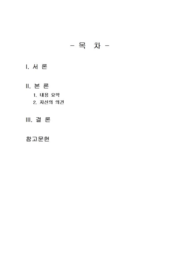 - ¸ñ Â÷ - I. ¼ ·Ð II. º» ·Ð 1. ³»¿ë ¿ä¾à 2. ÀÚ½ÅÀÇ ÀÇ°ß III. °á ·Ð Âü°í¹®Çå ** ÇÔ²² Á¦°øµÇ´Â Âü°íÀÚ·á ÇÑ±ÛÆÄÀÏ ** 1. ¿©»çÀåÀÇ Åº»ý¿¡ ´ëÇÑ ³ªÀÇ Àǰß.hwp 2. ¿©»çÀåÀÇ Åº»ý¿¡ ´ëÇÑ ³ªÀÇ Àǰß2.hwp 3. ¿©»çÀåÀÇ Åº»ýÀÇ Áß¿ä ³»¿ë ¿ä¾à.hwp 4. ¿©»çÀåÀÇ Åº»ýÀÇ Áß¿ä ³»¿ë ¿ä¾à2.hwp 5. Ä¿¸®¾î ±×¸®°í °¡Á¤¿¡ ´ëÇÑ ³ªÀÇ Àǰß.hwp 6. Ä¿¸®¾î ±×¸®°í °¡Á¤¿¡ ´ëÇÑ ³ªÀÇ Àǰß2.hwp 7. Ä¿¸®¾î ±×¸®°í °¡Á¤ÀÇ Áß¿ä ³»¿ë ¿ä¾à.hwp 8. Ä¿¸®¾î ±×¸®°í °¡Á¤ÀÇ Áß¿ä ³»¿ë ¿ä¾à2.hwp 9. ÆøÁÖÇÏ´Â ³²¼º¼º¿¡ ´ëÇÑ ³ªÀÇ Àǰß.hwp 10. ÆøÁÖÇÏ´Â ³²¼º¼º¿¡ ´ëÇÑ ³ªÀÇ Àǰß2.hwp 11. ÆøÁÖÇÏ´Â ³²¼º¼ºÀÇ Áß¿ä ³»¿ë ¿ä¾à.hwp 12. ÆøÁÖÇÏ´Â ³²¼º¼ºÀÇ Áß¿ä ³»¿ë ¿ä¾à2.hwp ¢ºÀÚ·á³»¿ë ¹Ì¸®º¸±â