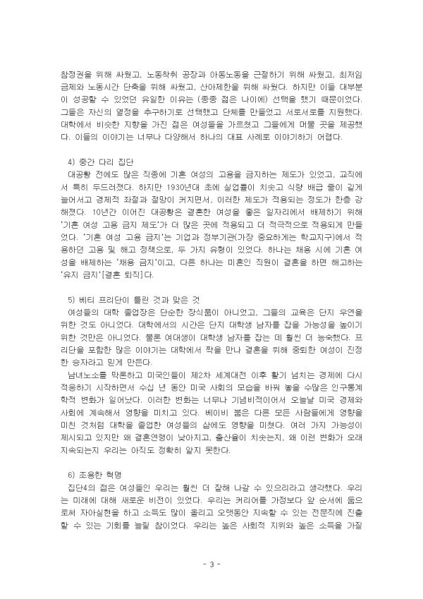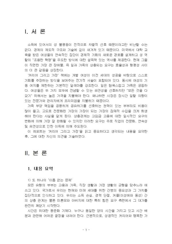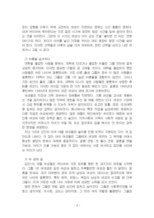 ¼Òµæ¿¡ ÀÖ¾î¼ÀÇ ¼º ºÒÆòµîÀÌ ÀüÀûÀ¸·Î Â÷º°Àû ¼±È£ ¶§¹®À̶ó°í¸¸ ºñ³ÇÒ ¼ö´Â ¾ø´Ù. °æÁ¦ÀÇ Á¦µµÀû ±¸Á¶¿Í ±â¼ú¿¡ ±íÀÌ »õ°ÜÁ® Àֱ⠶§¹®ÀÌ´Ù. ¹Ì±¹¿¡¼ ´ëÇÐ ±³À°À» ¹ÞÀº ¿©¼ºµéÀÇ ¿¬¼ÓÀûÀÎ Áý´ÜÀÌ °æÁ¦Àû ±âȸÀÇ »õ·Î¿î °æ·Î¸¦ ¼³°èÇÏ°í ¼º ¿ªÇÒÀÇ "Á¶¿ëÇÑ Çõ¸í"À» ÁÖµµÇÑ ¹æ½Ä¿¡ ´ëÇÑ ¼³µæ·Â ÀÖ´Â ¿ª»ç¸¦ Á¦°øÇÑ´Ù. ÇöÀç ±×µéÀÌ Á÷¸éÇÑ °¡Àå Å« Àå¾Ö¹°, Áï Àϰú °¡Á·ÀÇ »óÃæµÇ´Â ¿ä±¸´Â È¿À²¼º°ú ÇüÆò¼º »çÀÌÀÇ ´õ Å« °¥µîÀ» »ó¡ÇÑ´Ù. 'Ä¿¸®¾î ±×¸®°í °¡Á¤' Ã¥¿¡´Â °³º° ¿©¼ºÀÌ ÀÌÀü ¼¼´ëÀÇ ¼º°øÀ» ¹ÙÅÁÀ¸·Î ½º½º·Î ±âȸ¸¦ ÁÖÀåÇÏ´Â ¹æ½ÄÀ» º¸¿©ÁÖ´Â Àü±âÀû ¼¼úÀÌ Æ÷ÇԵǾî ÀÖ´Ù. µ¿½Ã¿¡ ¿©¼ºÀÇ ±âµ¿ ¿©Áö¸¦ Á¦ÇÑÇÏ´Â ±âº»ÀûÀÎ µô·¹¸¶¸¦ °Á¶ÇÑ´Ù. ÀÏÀº Ž¿å½º·´°í °¡Á·Àº ±ÃÇÌÇÏ´Ù. ¿©¼ºµéÀº µÎ °¡Áö ¸ðµÎ¿¡ Àü³äÇÒ ¼ö ÀÖ´Â À¯¿¬¼ºÀ» ¼±È£ÇÏÁö¸¸ "¸ðµç °ÍÀ» ´Ù °®±â" À§Çؼ´Â ³ôÀº °¡°ÝÀ» ÁöºÒÇØ¾ß ÇÑ´Ù. ¿Ö³ÄÇÏ¸é ½ÃÀåÀº Àå½Ã°£ ÀÏÇÒ ÀÇÇâÀÌ ÀÖ´Â Àü¹®°¡¿Í °ü¸®ÀÚ¿¡°Ô ÇÁ¸®¹Ì¾öÀ» ÁöºÒÇϱ⠶§¹®ÀÌ´Ù. °¡Á· ºÎ¾ç Ã¥ÀÓÀ» °øÆòÇÏ°Ô °øÀ¯Çϱ⸦ ¼±È£ÇÏ´Â ±Ç·ÂÀÌ ÀÖ´Â ºÎºÎ¶óµµ ºñ¿ëÀÌ ¸¹ÀÌ µé°í, °íµµ·Î Àü¹®ÈµÈ °¡ÀåÀÇ °¡ÀåÀÌ µÇ´Â °¡ÀåÀÇ ÀáÀçÀû ¼öÀÔÀ» Å©°Ô Èñ»ýÇØ¾ß ÇÑ´Ù´Â »ç½ÇÀ» ¾Ë°Ô µÈ´Ù. »óÃæ°ü°è´Â °íÀÓ±Ý °í¿ë¿¡ ´ëÇÑ ÀϽÃÀûÀÎ ¿ä±¸ÀÇ º¯È¿¡ ÀÇÇØ °¡Àå Àß ¿Ï鵃 ¼ö ÀÖÁö¸¸ ÀÌ·¯ÇÑ ¿ä±¸´Â ÁÖ·Î Á÷¾÷ÀÇ Àü¹®È, ¿¬¼Ó¼º ¹× À¯¿¬¼ºÀ¸·Î ÀÎÇÑ À̵濡 ÀÇÇØ ÁÖµµµÈ´Ù. ÀÌ ·¹Æ÷Æ®´Â 'Ä¿¸®¾î ±×¸®°í °¡Á¤'À» Àаí Áß¿äÇÏ´Ù°í »ý°¢µÇ´Â ³»¿ëÀ» ¿ä¾àÇÑ ÈÄ, ±×¿¡ ´ëÇÑ ÀÚ½ÅÀÇ ÀǰßÀ» ±â¼úÇÏ¿´´Ù. II. º» ·Ð 1. ³»¿ë ¿ä¾à 1) ¶Ç ÇϳªÀÇ ¡®À̸§ ¾ø´Â ¹®Á¦¡¯ ¸ðµç À¯ÇüÀÇ ºÎºÎ´Â °í¿ë°ú °¡Á·, Á÷Àå »ýȰ°ú °¡Á¤ »ýȰÀÇ ±ÕÇüÀ» ¸ÂÃß´À¶ó ¾Ö¾²°í ÀÖ´Ù. ±¹°¡·Î¼ ¿ì¸®´Â ÇöÀç¿Í ¹Ì·¡ ¼¼´ë¸¦ À§ÇÑ °£º´ÀÇ Á߿伺°ú ±× °¡Ä¡¸¦ Áý´ÜÀûÀ¸·Î ÀνÄÇϰí ÀÖ´Ù. ¿ì¸®´Â ¼Òµæ ¼Õ½Ç, °æ·Â ´ÜÀý, Ä¿ÇÃ(À̼º¾Ö¿Í µ¿¼º) °£ÀÇ »óÃæ °ü°è´Â ¹°·Ð ¹ÌÈ¥¸ð¿Í ¾Æ¹öÁö¿¡ ´ëÇÑ Æ¯È÷ Èûµç ¿ä±¸ Ãø¸é¿¡¼ ±× ´ë°¡¸¦ ¿ÏÀüÈ÷ ±ú´Ý±â ½ÃÀÛÇß´Ù. ½Ã°£Àº À§´ëÇÑ ÆòÁØÈ ±âÁ¦´Ù. ´©±¸³ª µ¿ÀÏÇÑ ¾çÀÇ ½Ã°£À» °¡Áö°í ÀÖ°í ½Ã°£ ¹èºÐ°ú °ü·ÃÇØ ¾î·Á¿î °áÁ¤À» ³»·Á¾ß ÇÑ´Ù. ±Ùº»ÀûÀ¸·Î, ¼º°øÀûÀÎ Ä¿¸®¾î¿Í ÇູÇÑ °¡Á¤ÀÇ ±ÕÇüÀ» ÀÌ·ç±â À§ÇØ °íÀüÇÏ´Â ¿©¼ºÀÌ Á÷¸éÇÏ´Â ¹®Á¦´Â ½Ã°£ Ãæµ¹ÀÇ ¹®Á¦´Ù. ´ë°³ Ä¿¸®¾î¿¡ ÅõÀÚÇÑ´Ù´Â °ÍÀº ÀþÀº ½Ã±â¿¡ ±²ÀåÈ÷ ¸¹Àº ½Ã°£À» ÀÏ¿¡ ½ñ¾Æ¾ß ÇÑ´Ù´Â °ÍÀ» ÀǹÌÇÑ´Ù. ±×·±µ¥ ÀÌ ½Ã±â´Â ¿©¼ºÀÌ ¾ÆÀÌ °®´Â °ÍÀ» ¡®³õÄ¡¸é ¾È µÇ´Â¡¯ ¿¬·É´ëÀ̱⵵ ÇÏ´Ù. °Ô´Ù°¡ ¾ÆÀ̸¦ ³º°í °¡Á¤À» ²Ù¸®´Â µ¥µµ ±²ÀåÈ÷ ¸¹Àº ½Ã°£À» ½ñ¾Æ¾ß ÇÑ´Ù. ÀÌ·¯ÇÑ ¼±ÅõéÀº ÀÌÈÄÀÇ »îÀ» Å©°Ô Á¿ìÇϸç, Çѹø ¼±ÅÃÀ» ³»¸®°í ³ª¸é ¹«¸£°Å³ª °íÄ¥ ¼ö ¾ø´Ù. 2) ¹ÙÅëÀ» ³Ñ°ÜÁÖ´Ù ´ëÇÐÀ» Á¹¾÷ÇÑ »ç¶÷µé Áß¿¡¼. ´ëÇп¡ ´Ù³æ°Å³ª Á¹¾÷ÇÑ ºñÀ²Àº ±×·ì Àü¹Ý¿¡ °ÉÃÄ »ó´çÈ÷ Áõ°¡Çϸç, ÀÌ·¯ÇÑ Áß¿äÇÑ ±¸º°Àº °ð °í·ÁµÉ °ÍÀÌ´Ù. ´ëÇÐÀ» Á¹¾÷ÇÏÁö ¸øÇÑ »ç¶÷µéÀº ¾î¸° ³ªÀÌ¿¡ °áÈ¥ÇßÀ¸¸ç, °¡Àå À̸¥ Ãâ»ý ±×·ìÀÇ °æ¿ì ´õ ¸¹Àº »ç¶÷µéÀÌ °áÈ¥Çß´Ù. ´ëÇÐÀÌ ¾Æ´Ñ ±×·ìÀº ±×·ì 1ÀÇ ³ôÀº ºñÈ¥À²À» °æÇèÇÏÁö ¾Ê¾Ò´Ù. ±×·¯³ª °¡Àå ÃÖ±ÙÀÇ Ãâ»ý ±×·ìÀÇ °æ¿ì, ´ëÇп¡ ´Ù´ÏÁö ¾ÊÀº »ç¶÷µéÀº °áÈ¥¿¡¼ »ó´çÇÑ ÈÄÅ𸦠°Þ¾ú´Ù. ÀÌ·¯ÇÑ Â÷ÀÌÁ¡ °¡¿îµ¥ ÇÑ °¡Áö Áß¿äÇÑ ¿¹¿Ü°¡ ÀÖ´Ù. °áÈ¥Àº 1940³â´ë ÈĹݺÎÅÍ 1960³â´ë ÃʹݱîÁö ¸ðµç ¿©¼ºÀÇ »ý¾Ö Ãʱ⿡ ÀÌ·ç¾îÁ³´Ù. ¿©¼ºµéÀº Á÷Àå°ú °¡Á· ¸ðµÎ¿¡¼ Àå¾Ö¹°¿¡ Á÷¸éÇß´Ù. ±âÈ¥ ¿©¼ºÀ» ±³»ç·Î ä¿ëÇÏ´Â °ÍÀ» ±ÝÁöÇϰųª ¸¹Àº Á÷Ã¥¿¡ Á¦ÇÑÀ» µÎ´Â µî ä¿ë Á¦ÇÑÀÌ ÀÖ´Ù. ¿©¼ºÀÌ ±â°ü¿¡¼ °í±Þ ÇÐÀ§¸¦ ÃëµæÇÒ ¼ö ÀÖ´ÂÁö ¿©ºÎ°¡ ±ÝÁöµÇ¾ú´Ù. ÃÖ°íÀÇ ¹ý·ü, °æ¿µ, Àǰú´ëÇÐ Áß ÀϺδ ¿©¼º ÀÔÇÐÀÌ ±ÝÁöµÇ¾ú´Ù. ȸ»ç¿¡¼´Â ƯÁ¤ Á÷¾÷À» ³²¼º¿¡°Ô¸¸ Á¦°øÇÏ°í ´Ù¸¥ Á÷¾÷Àº ¿©¼º¿¡°Ô¸¸ Á¦°øÇß´Ù. ¸¹Àº Á¦Ç°ÀÌ ¹éÀο¡°Ô¸¸ ÁÖ¾îÁ³±â ¶§¹®¿¡ À¯»öÀÎÁ¾ ¿©¼º¿¡ ´ëÇÑ À庮Àº ÈξÀ ´õ ³ô¾Ò´Ù. Áö¿ª»çȸ¿Í °¡Á·ÀÇ »çȸÀû ±Ô¹üÀº ´ú °ø½ÄÀûÀÌÁö¸¸ ¾î¸Ó´Ï°¡ Àڳడ ¾î¸± ¶§, ¶Ç´Â ¾ÕÀ¸·Îµµ ÀÏÀ» ÇØ¼´Â ¾È µÈ´Ù´Â °·ÂÇÑ ¸í·ÉÀ» Á¦°øÇß´Ù. Áö³ 100¿© ³â°£ÀÇ ¹Ì±¹ ´ëÁ¹ ¿©¼ºµ