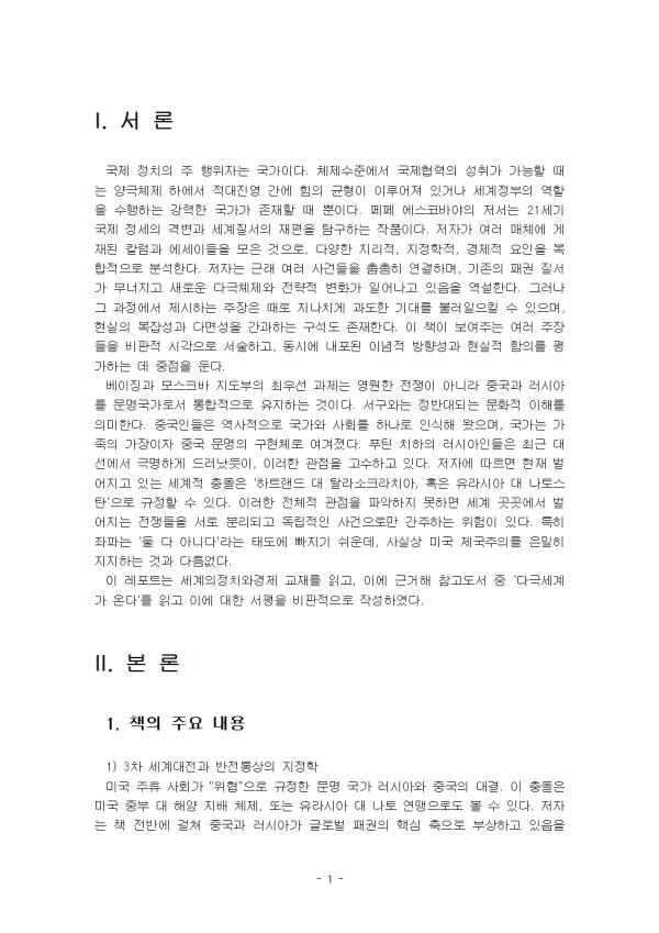 ÀÌ ·¹Æ÷Æ®´Â ¼¼°èÀÇÁ¤Ä¡¿Í°æÁ¦ ±³À縦 Àаí, ÀÌ¿¡ ±Ù°ÅÇØ Âü°íµµ¼­ Áß '´Ù±Ø¼¼°è°¡ ¿Â´Ù'¸¦ Àаí ÀÌ¿¡ ´ëÇÑ ¼­ÆòÀ» ºñÆÇÀûÀ¸·Î ÀÛ¼ºÇÏ¿´´Ù.