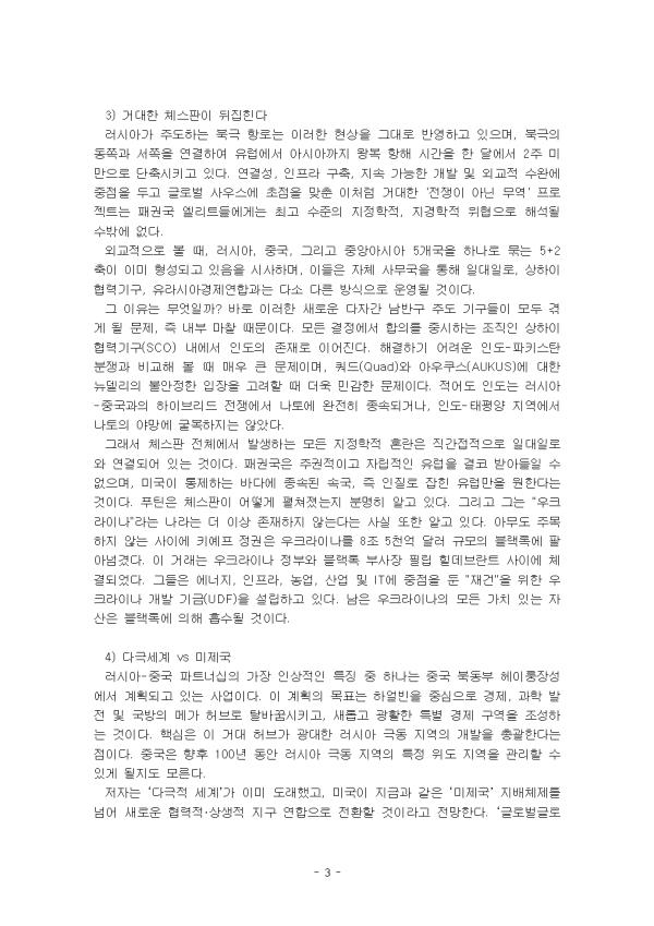 º£ÀÌ¡°ú ¸ð½ºÅ©¹Ù ÁöµµºÎÀÇ ÃÖ¿ì¼± °úÁ¦´Â ¿µ¿øÇÑ ÀüÀïÀÌ ¾Æ´Ï¶ó Áß±¹°ú ·¯½Ã¾Æ¸¦ ¹®¸í±¹°¡·Î¼­ ÅëÇÕÀûÀ¸·Î À¯ÁöÇÏ´Â °ÍÀÌ´Ù. ¼­±¸¿Í´Â Á¤¹Ý´ëµÇ´Â ¹®È­Àû ÀÌÇØ¸¦ ÀǹÌÇÑ´Ù. Áß±¹ÀεéÀº ¿ª»çÀûÀ¸·Î ±¹°¡¿Í »çȸ¸¦ Çϳª·Î ÀνÄÇØ ¿ÔÀ¸¸ç, ±¹°¡´Â °¡Á·ÀÇ °¡ÀåÀÌÀÚ Áß±¹ ¹®¸íÀÇ ±¸Çöü·Î ¿©°ÜÁ³´Ù. Ǫƾ Ä¡ÇÏÀÇ ·¯½Ã¾ÆÀεéÀº ÃÖ±Ù ´ë¼±¿¡¼­ ±Ø¸íÇÏ°Ô µå·¯³µµíÀÌ, ÀÌ·¯ÇÑ °üÁ¡À» °í¼öÇϰí ÀÖ´Ù. ÀúÀÚ¿¡ µû¸£¸é ÇöÀç ¹ú¾îÁö°í ÀÖ´Â ¼¼°èÀû Ãæµ¹Àº 'ÇÏÆ®·£µå ´ë Å»¶ó¼ÒÅ©¶óÄ¡¾Æ, ȤÀº À¯¶ó½Ã¾Æ ´ë ³ªÅ佺ź'À¸·Î ±ÔÁ¤ÇÒ ¼ö ÀÖ´Ù. ÀÌ·¯ÇÑ ÀüüÀû °üÁ¡À» ÆÄ¾ÇÇÏÁö ¸øÇÏ¸é ¼¼°è °÷°÷¿¡¼­ ¹ú¾îÁö´Â ÀüÀïµéÀ» ¼­·Î ºÐ¸®µÇ°í µ¶¸³ÀûÀÎ »ç°ÇÀ¸·Î¸¸ °£ÁÖÇÏ´Â À§ÇèÀÌ ÀÖ´Ù. ƯÈ÷ ÁÂÆÄ´Â 'µÑ ´Ù ¾Æ´Ï´Ù'¶ó´Â ŵµ¿¡ ºüÁö±â ½¬¿îµ¥, »ç½Ç»ó ¹Ì±¹ Á¦±¹ÁÖÀǸ¦ Àº¹ÐÈ÷ ÁöÁöÇÏ´Â °Í°ú ´Ù¸§¾ø´Ù.