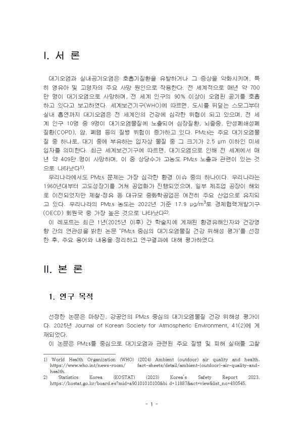 ÀÌ ·¹Æ÷Æ®´Â ÃÖ±Ù 1³â(2025³â ÀÌÈÄ) °£ ÇмúÁö¿¡ °ÔÀçµÈ ȯ°æÀ¯ÇØÀÎÀÚ¿Í °Ç°­¿µÇâ °£ÀÇ ¿¬°ü¼ºÀ» ¹àÈù ³í¹® ¡¯PM2.5 Áß½ÉÀÇ ´ë±â¿À¿°¹°Áú °Ç°­ À§Çؼº Æò°¡¡®¸¦ ¼±Á¤ÇÑ ÈÄ, ÁÖ¿ä ¿ë¾î¿Í ³»¿ëÀ» Á¤¸®ÇÏ°í ¿¬±¸°á°ú¿¡ ´ëÇØ Æò°¡ÇÏ¿´´Ù.