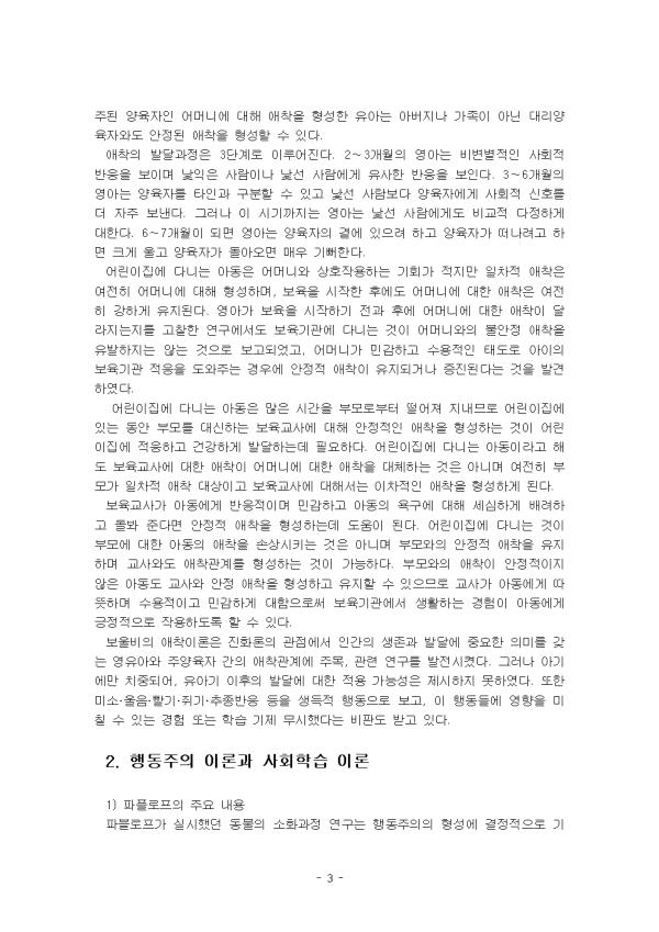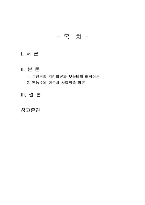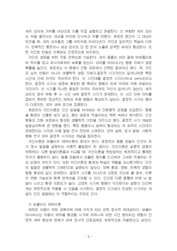 ·Î·»Ã÷ÀÇ °¢ÀÎÀÌ·ÐÀº Àΰ£ ¹ß´ÞÀ» ¹Ù¶óº¸´Â µ¥ ÁøÈ·ÐÀû °üÁ¡À» µµÀÔÇÑ´Ù. ÇൿÀ» ȯ°æÀÇ »ê¹°·Î º¸Áö ¾Ê°í, Á¾ÀÇ »ýÁ¸°ú ÀûÀÀÀ̶ó´Â ¸Æ¶ô ¼Ó¿¡¼ ÇØ¼®ÇÑ´Ù. Àΰ£ Çൿµµ ÁøÈ °úÁ¤¿¡¼ Çü¼ºµÈ »ý¹°ÇÐÀû ±â¹ÝÀ» °¡Áø´Ù°í º»´Ù. °áÁ¤Àû ½Ã±â °³³äÀº ¹ß´Þ½É¸®Çп¡ Å« ¿µÇâÀ» ÁØ´Ù. ƯÁ¤ ÇൿÀ̳ª ´É·ÂÀÌ Çü¼ºµÇ´Â µ¥ ÃÖÀûÀÇ ½Ã°£´ë°¡ Á¸ÀçÇÑ´Ù´Â ½Ã°¢Àº ¾Æµ¿ ¹ß´Þ ¿¬±¸ Àü¹Ý¿¡ ½º¸çµç´Ù. ¾ð¾î ½Àµæ, Á¤¼ ¹ß´Þ, »çȸÀû Çൿ ¿¬±¸ ¸ðµÎ °áÁ¤Àû ½Ã±â¶ó´Â °³³äÀ» ÂüÁ¶ÇÑ´Ù. ¿µ¾Æ±â¿¡ ¹ß»ýÇÏ´Â °¡Àå Áß¿äÇÑ ÇüÅÂÀÇ »çȸÀû ¹ß´ÞÀÌ ¾ÖÂøÀÌ´Ù. ¾ÖÂøÀ̶õ ¿µ¾Æ¿Í ¾çÀ°ÀÚ °£¿¡ Çü¼ºµÇ´Â Ä£¹ÐÇÑ Á¤¼Àû À¯´ë°¨À¸·Î, Ãʱ⿡ ¾çÀ°ÀÚ¿Í ¾î¶°ÇÑ °ü°è¸¦ Çü¼ºÇÏ¿´´À³Ä¿¡ µû¶ó ¾ÈÁ¤ ¾ÖÂøÀ» Çü¼ºÇϱ⵵ ÇÏ¸ç ºÒ¾ÈÁ¤ÇÑ ¾ÖÂøÀ» Çü¼ºÇϱ⵵ ÇÑ´Ù. ¾ÈÁ¤ ¾ÖÂøÀ» Çü¼ºÇÑ ¿µ¾Æ´Â ¾çÀ°ÀÚ¸¦ ¾ÈÀü±âÁö·Î »ï°í ȯ°æÀ» Àû±ØÀûÀ¸·Î Ž»öÇÑ´Ù. »ýÀÇ Ãʱ⿡ Çü¼ºµÈ ¾ÈÁ¤ ¾ÖÂøÀº ÀÌÈÄÀÇ ½É¸®Àû ¹ß´ÞÀÇ Åä´ë°¡ µÈ´Ù. ÇൿÁÖÀÇ´Â Á÷Á¢ °üÂû °¡´ÉÇÑ »ç°Ç¿¡¼ Àڱذú ¹ÝÀÀÀÌ ¾î¶»°Ô ³ªÅ¸³ª´À³Ä¿¡ ¿¬±¸ÀÇ ÃÊÁ¡À» µÐ´Ù. ÇൿÀû °üÁ¡Àº º¸ÀÌÁö ¾Ê´Â Á¤½Å ³»¸éÀÇ ÀÛµ¿ ±âÁ¦¿¡ ÁÖ¸ñÇϱ⺸´Ù´Â Àڱذú ¹ÝÀÀÀ̶ó´Â, ´«À¸·Î È®ÀÎÇϰí ÃøÁ¤ÇÒ ¼ö ÀÖ´Â ÀÚ·á¿¡ ±Ù°ÅÇØ¼ Á÷Á¢ °üÂû °¡´ÉÇÑ ÇൿÀÇ ÇнÀ °úÁ¤¿¡ °ü½ÉÀ» µÐ´Ù. ÀÌ ·¹Æ÷Æ®´Â ·Î·»Ã÷ÀÇ °¢ÀÎÀ̷аú º¸¿ïºñÀÇ ¾ÖÂøÀÌ·Ð, ÇൿÁÖÀÇ À̷аú »çȸÇнÀ ÀÌ·ÐÀ» ´ëÇ¥ÇÏ´Â ÆÄÇ÷ÎÇÁ, ¿Ó½¼, ½ºÅ°³Ê°¡ Á¦¾ÈÇÑ ÁÖ¿ä ³»¿ëÀ» ¼³¸íÇϰí, ¼¼ ÀÌ·Ð(ÆÄºí·ÎÇÁ, ¿Ó½¼, ½ºÅ°³Ê)À» ºñ±³ÇÏ¿© ³íÇÏ¿´´Ù. II. º» ·Ð 1. ·Î·»Ã÷ÀÇ °¢ÀÎÀ̷аú º¸¿ïºñÀÇ ¾ÖÂøÀÌ·Ð 1) ·Î·»Ã÷ÀÇ °¢ÀÎÀÌ·Ð ·Î·»Ã÷(Konrad Lorenz)´Â µ¿¹° ÇൿÀ» ÀÌÇØÇÏ·Á¸é ÀÚ¿¬ »óÅ¿¡¼ Á÷Á¢ °üÂûÇØ¾ß ÇÑ´Ù°í ÁÖÀåÇÑ´Ù. ½ÇÇè½ÇÀÌ ¾Æ´Ñ ÀÚ¿¬È¯°æ¿¡¼ÀÇ °üÂû¸¸ÀÌ µ¿¹° °íÀ¯ÀÇ »ýÅÂ¿Í Çൿ ÆÐÅÏÀ» µå·¯³½´Ù°í º»´Ù. ÀÌ ÀÔÀåÀ» ÀÚ¿¬°üÂû¹ýÀ̶ó ºÎ¸¥´Ù. ÀÚ¿¬°üÂûÀº µ¿¹°ÀÌ È¯°æ¿¡ ¾î¶»°Ô ÀûÀÀÇÏ´ÂÁö¸¦ ÀÖ´Â ±×´ë·Î ÆÄ¾ÇÇÏ´Â ¹æ¹ýÀÌ´Ù. ·Î·»Ã÷´Â ÀÚ¿¬È¯°æ ¼Ó¿¡¼ ƯÁ¤ ÀÚ±ØÀÌ ÁÖ¾îÁú ¶§ Á¾ ƯÀ¯ÀÇ ÇൿÀÌ À¯¹ßµÈ´Ù´Â »ç½ÇÀ» È®ÀÎÇÑ´Ù. ÀÌ ÇൿÀº ÇнÀÀÌ ¾Æ´Ñ »ý¹°ÇÐÀû ÇÁ·Î±×·¥¿¡ µû¶ó ÀÛµ¿ÇÑ´Ù. °¢ÀÎ(imprinting)Àº ¾î¸° µ¿¹°ÀÌ »ýÈÄ ÃʱâÀÇ Æ¯Á¤ ½Ã±â µ¿¾È ¾î¶² ´ë»ó¿¡ Áö¼ÓÀûÀ¸·Î ³ëÃâµÉ ¶§, ±× ´ë»ó¿¡ ´ëÇÑ À¯´ë¿Í ÃßÁ¾¹ÝÀÀÀÌ Çü¼ºµÇ´Â Çö»óÀÌ´Ù. ·Î·»Ã÷´Â »õ³¢ ¿À¸®¿Í °ÅÀ§¸¦ ´ë»óÀ¸·Î À̸¦ Á÷Á¢ ½ÇÇèÇÏ°í °üÂûÇÑ´Ù. °« ºÎÈÇÑ »õ³¢ ¿À¸®´Â óÀ½ ¿òÁ÷ÀÌ´Â ´ë»óÀ» ¾î¹Ì·Î ÀνÄÇÏ°í µÚ¸¦ µû¸¥´Ù. ·Î·»Ã÷ º»ÀÎÀÌ ±× ´ë»óÀÌ µÇ¾úÀ» ¶§, »õ³¢ ¿À¸®µéÀº ±×¸¦ ¾î¹Ìó·³ µû¶ó´Ù³æ´Ù. °¢ÀÎÀº ÀϹÝÀûÀÎ ÇнÀ°ú ´Ù¸£´Ù. ¹Ýº¹ÀûÀÎ ÈÆ·ÃÀ̳ª º¸»ó ¾øÀ̵µ ´Ü ÇÑ ¹øÀÇ ³ëÃâ·Î °·ÂÇÑ À¯´ë°¡ Çü¼ºµÈ´Ù. ¶ÇÇÑ °¢ÀÎµÈ ¹ÝÀÀÀº ÀÌÈÄ¿¡µµ ¾ÈÁ¤ÀûÀ¸·Î À¯ÁöµÈ´Ù. °¢ÀÎÀº »ýÁ¸À» À§ÇÑ ÀûÀÀ Àü·«À¸·Î ±â´ÉÇÑ´Ù. »õ³¢ µ¿¹°ÀÌ ¾î¹Ì °ç¿¡ ¸Ó¹«¸§À¸·Î½á ¸ÔÀ̸¦ ¾ò°í Æ÷½ÄÀڷκÎÅÍ º¸È£¸¦ ¹Þ´Â´Ù. ¾î¹Ì¸¦ µû¶ó´Ù´Ï´Â Çൿ ÀÚü°¡ »ýÁ¸ È®·üÀ» ³ôÀδÙ. ·Î·»Ã÷´Â ÀÌ ÇൿÀÌ ÁøÈ °úÁ¤¿¡¼ ¼±ÅÃµÈ °á°ú¶ó°í º»´Ù. Áï, °¢ÀÎÀº ½É¸® ¹ÝÀÀÀÌ ¾Æ´Ï¶ó »ý¹°ÇÐÀû »ýÁ¸ ±âÁ¦´Ù.°áÁ¤Àû ½Ã±â°¢ÀÎÀÌ ÀϾ·Á¸é ƯÁ¤ ½Ã°£´ë ¾È¿¡ ÀÚ±ØÀÌ ÁÖ¾îÁ®¾ß ÇÑ´Ù. ÀÌ ½Ã°£´ë¸¦ °áÁ¤Àû ½Ã±â(critical period)¶ó°í ÇÑ´Ù. °áÁ¤Àû ½Ã±â´Â »ýÁ¸¿¡ Áß¿äÇÑ Á¾ ƯÀ¯ÀÇ ÇൿÀÌ ¿ÜºÎ Àڱؿ¡ ÀÇÇØ À¯¹ßµÇ´Â ±¸°£ÀÌ´Ù. ÀÌ ½Ã±â¸¦ Áö³ª¸é µ¿ÀÏÇÑ ÀÚ±ØÀÌ ÁÖ¾îÁ®µµ °¢ÀÎÀÌ ÀϾÁö ¾Ê´Â´Ù. »õ³¢ ¿À¸®ÀÇ °æ¿ì ºÎÈ ÈÄ ¼ö ½Ã°£ ³»¿¡ °áÁ¤Àû ½Ã±â°¡ Á¸ÀçÇÑ´Ù. ÀÌ ½Ã°£ ¾È¿¡ ¾î¹Ì¸¦ Á¢ÇÏÁö ¸øÇϸé Á¤»óÀûÀÎ ¾ÖÂø°ú ÃßÁ¾ ÇൿÀÌ Çü¼ºµÇÁö ¾Ê´Â´Ù. °áÁ¤Àû ½Ã±â´Â Á¾¸¶´Ù ´Ù¸£Áö¸¸, ¸ðµÎ »ý¾Ö Ãʱ⿡ ÁýÁߵȴÙ. ·Î·»Ã÷ÀÇ °¢ÀÎÀÌ·ÐÀº Àΰ£ ¹ß´ÞÀ» ¹Ù¶óº¸´Â µ¥ ÁøÈ·ÐÀû °üÁ¡À» µµÀÔÇÑ´Ù. ÇൿÀ» ȯ°æÀÇ »ê¹°·Î º¸Áö ¾Ê°í, Á¾ÀÇ »ýÁ¸°ú ÀûÀÀÀ̶ó´Â ¸Æ¶ô ¼Ó¿¡¼ ÇØ¼®ÇÑ´Ù. Àΰ£ Çൿµµ ÁøÈ °úÁ¤¿¡¼ Çü¼ºµÈ »ý¹°ÇÐÀû ±â¹ÝÀ» °¡Áø´Ù°í º»´Ù. °áÁ¤Àû ½Ã±â °³³äÀº ¹ß´Þ½É¸®Çп¡ Å« ¿µÇâÀ» ÁØ´Ù. ƯÁ¤ ÇൿÀ̳ª ´É·ÂÀÌ Çü¼ºµÇ´Â µ¥ ÃÖÀûÀÇ ½Ã°£´ë°¡ Á¸ÀçÇÑ´Ù´Â ½Ã°¢Àº ¾Æµ¿ ¹ß´Þ ¿¬±¸ Àü¹Ý¿¡ ½º¸çµç´Ù. ¾ð¾î ½Àµæ, Á¤¼ ¹ß´Þ, »çȸÀû 